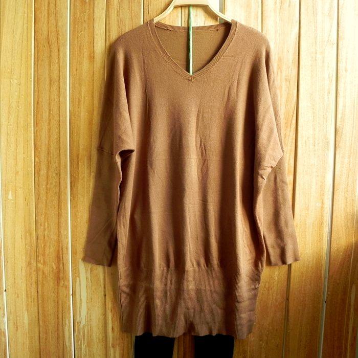 欧美 V领长款宽松针织衫 蝙蝠袖 针织裙 套头毛衣裙 罗纹下摆