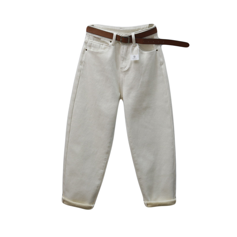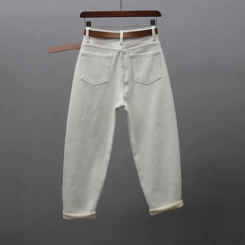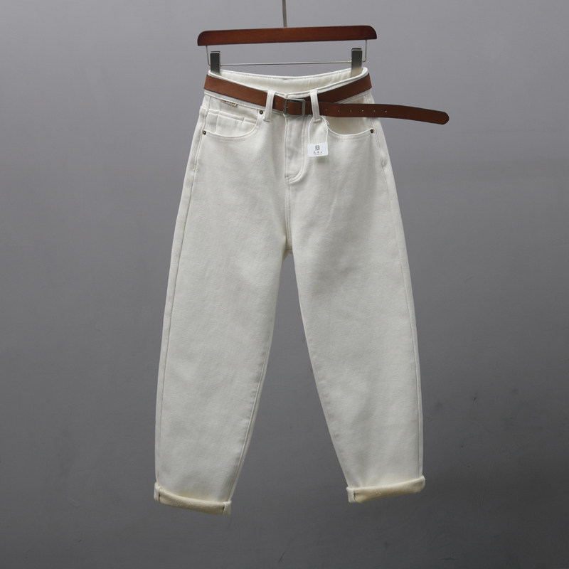 杏色加绒加厚老爹牛仔裤女2025冬新款高腰休闲宽松显瘦哈伦萝卜裤
