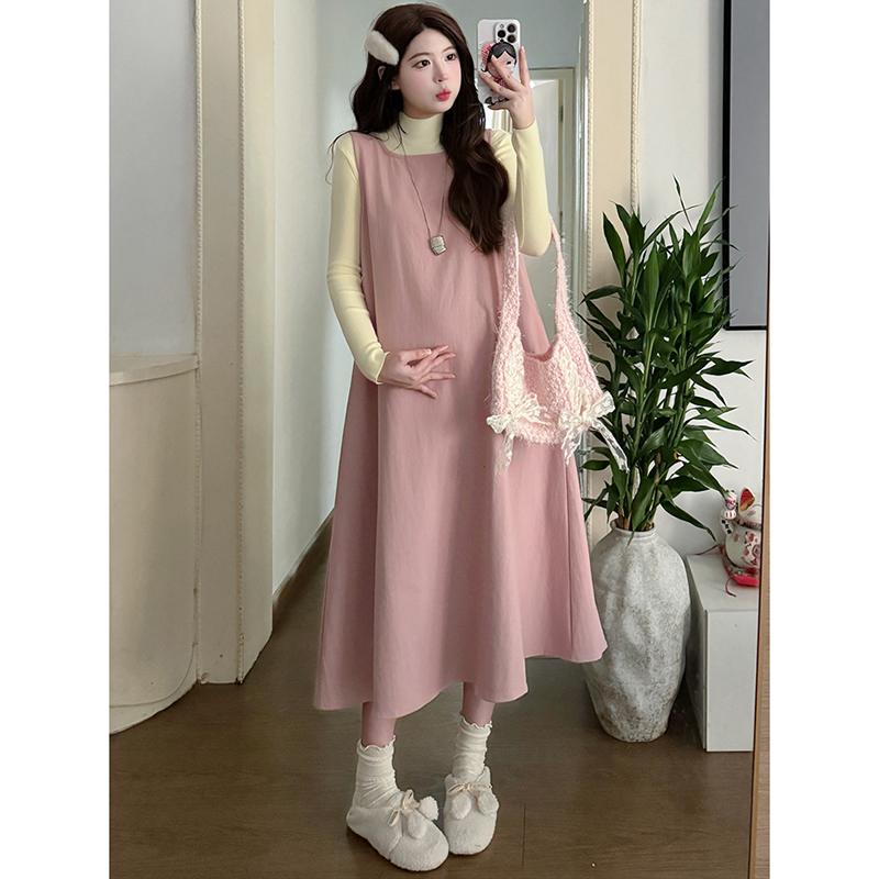 孕妇连衣裙套装春秋冬2025新款孕期穿搭粉色背带裙打底衫两件套女
