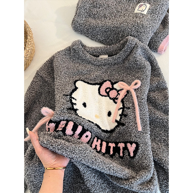 韩版甜美卡通Kitty猫半边绒睡衣女秋冬季加绒加厚保暖家居服套装