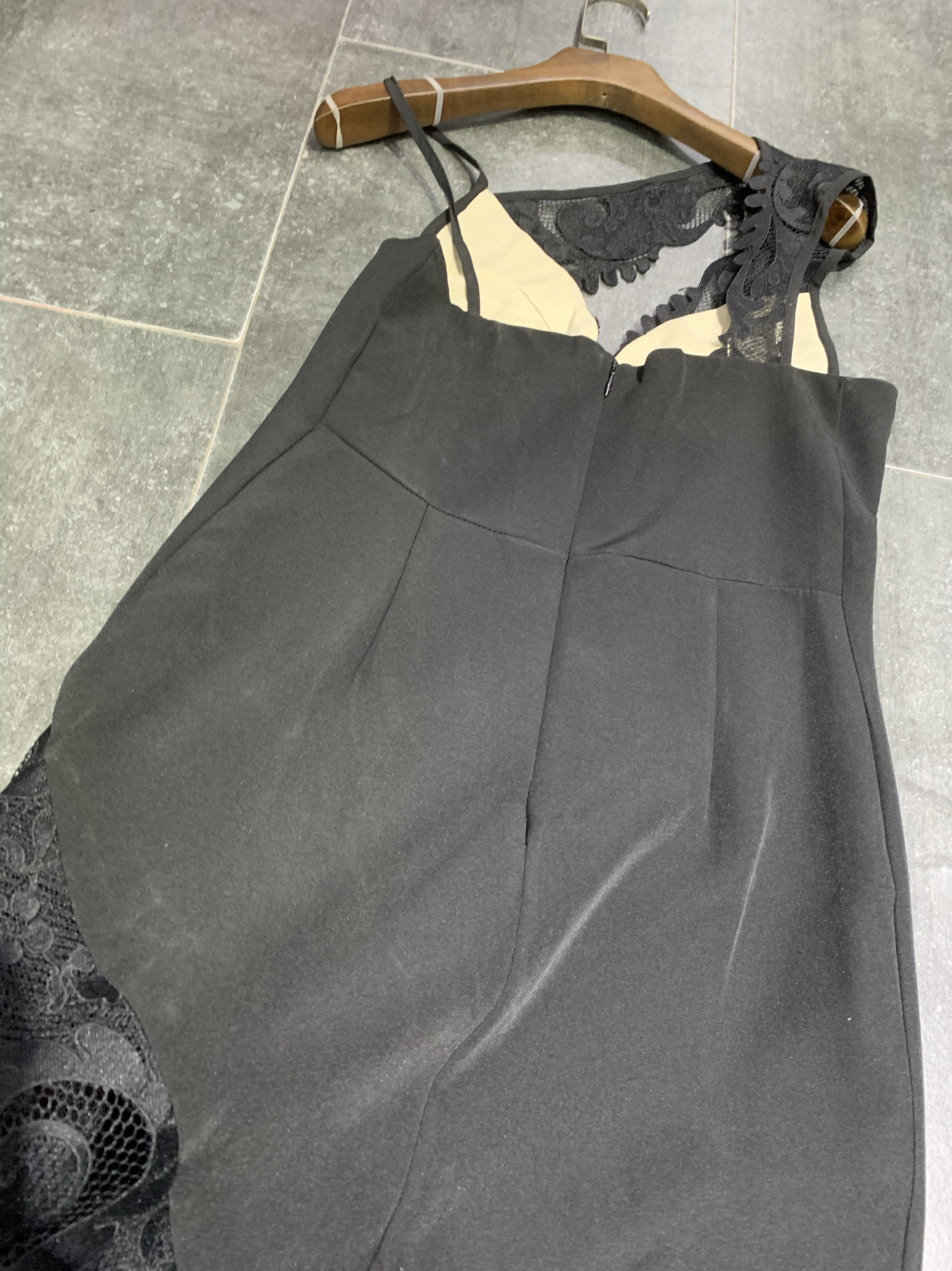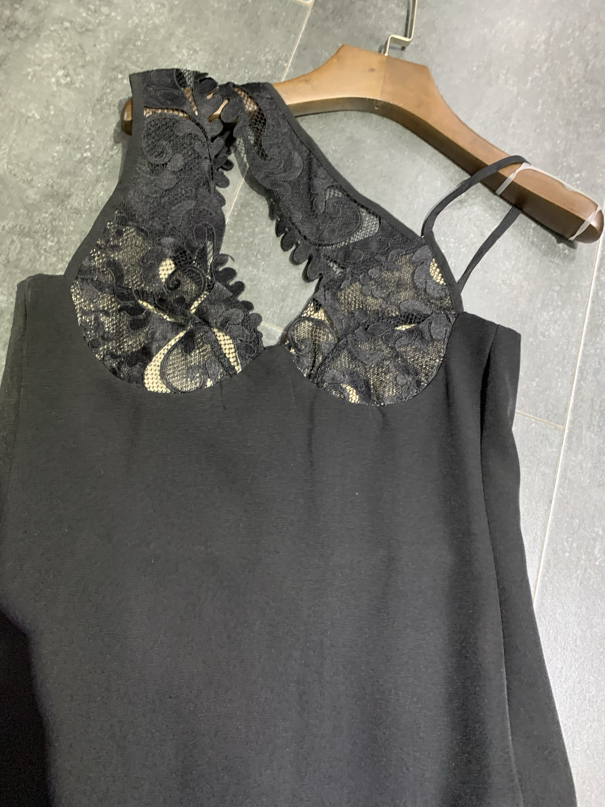 黑色拼接蕾丝性感不对称斜边裙摆夜场吊带连衣裙