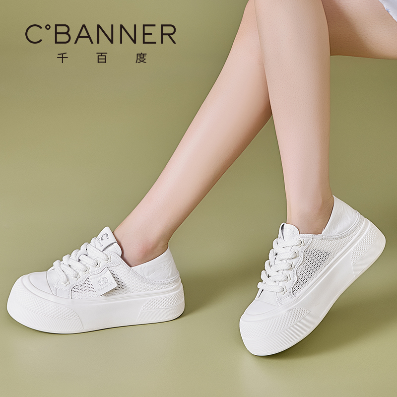 千百度小白鞋女2025夏季新款百搭厚底增高运动鞋透气网面休闲鞋女