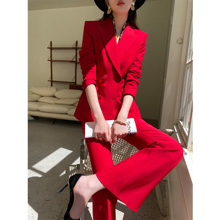 新款显瘦酒红色西装套装女春季微喇裤个性气质时尚职业女装工作服