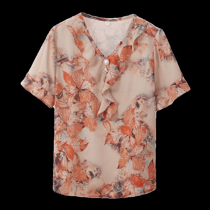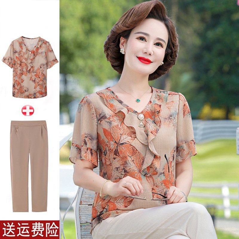 中年妈妈夏装短袖T恤洋气大码中老年人女装夏季雪纺小衫宽松上衣