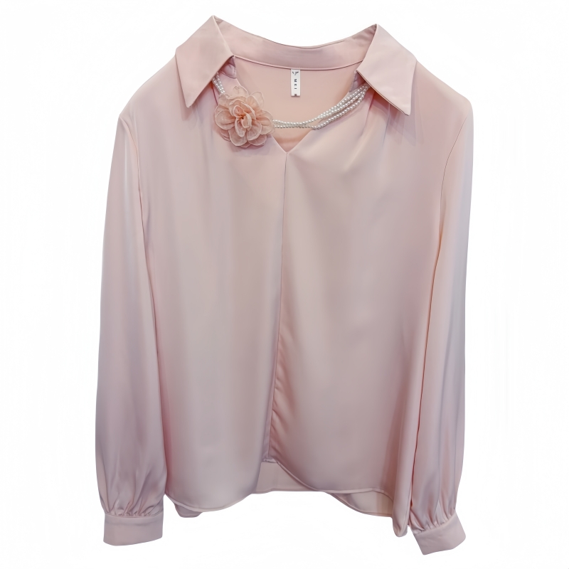 花朵翻V领醋酸缎面衬衫女春秋新款气质长袖打底雪纺衫上衣