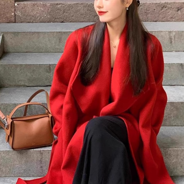 婚庆双面呢羊绒大衣女2025冬季级感圣诞红色中长款羊毛呢外套女