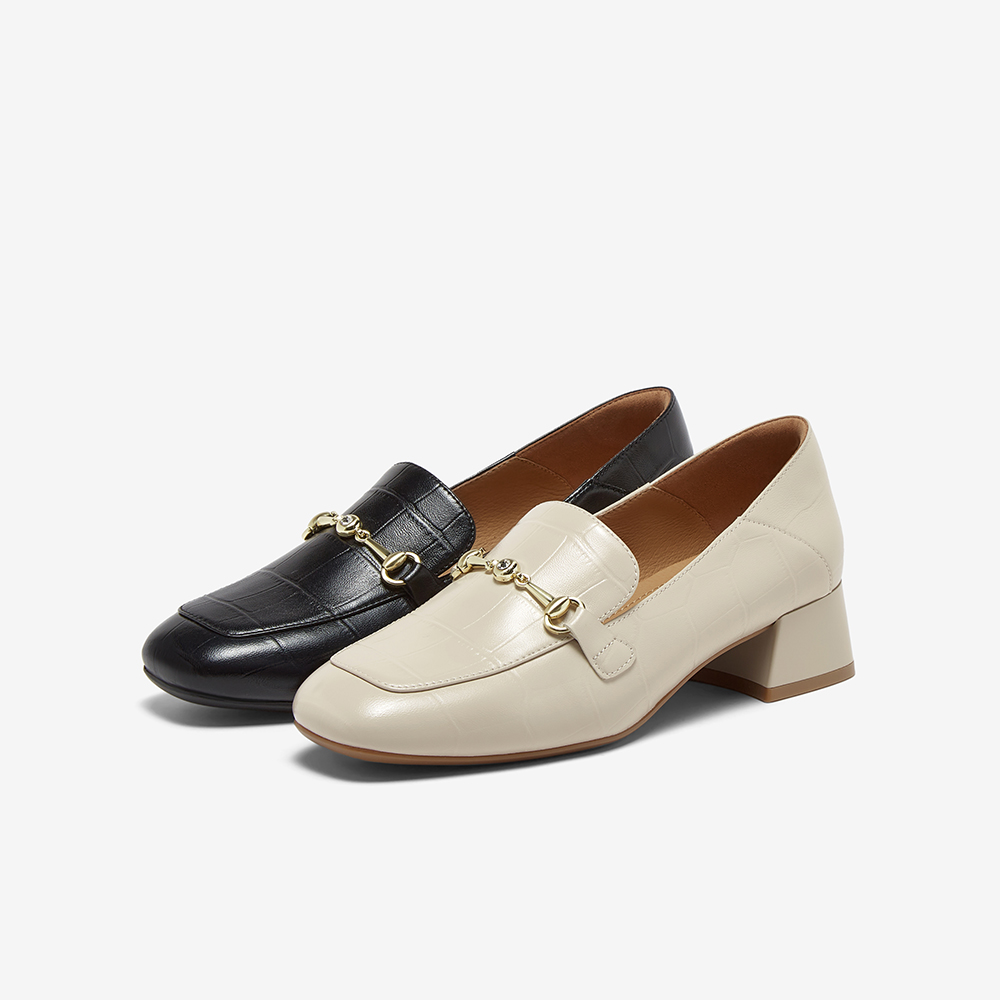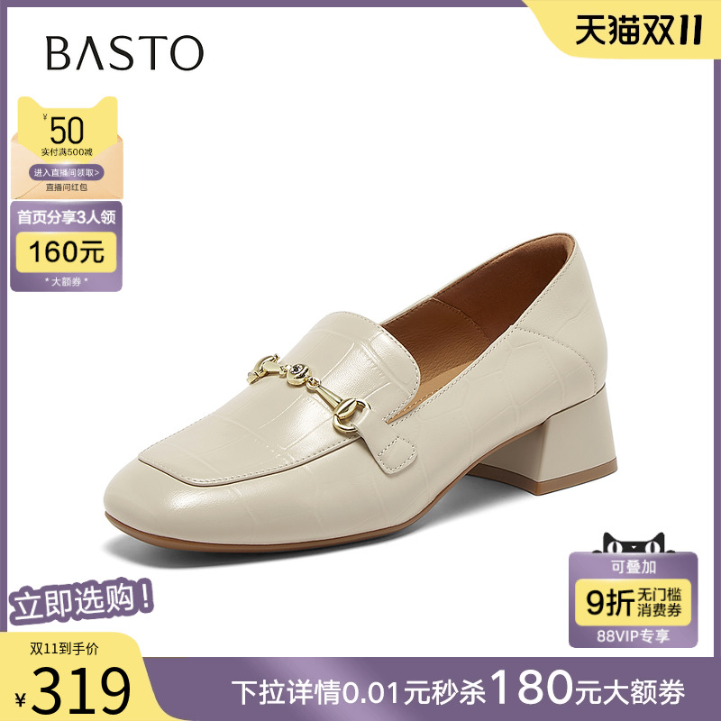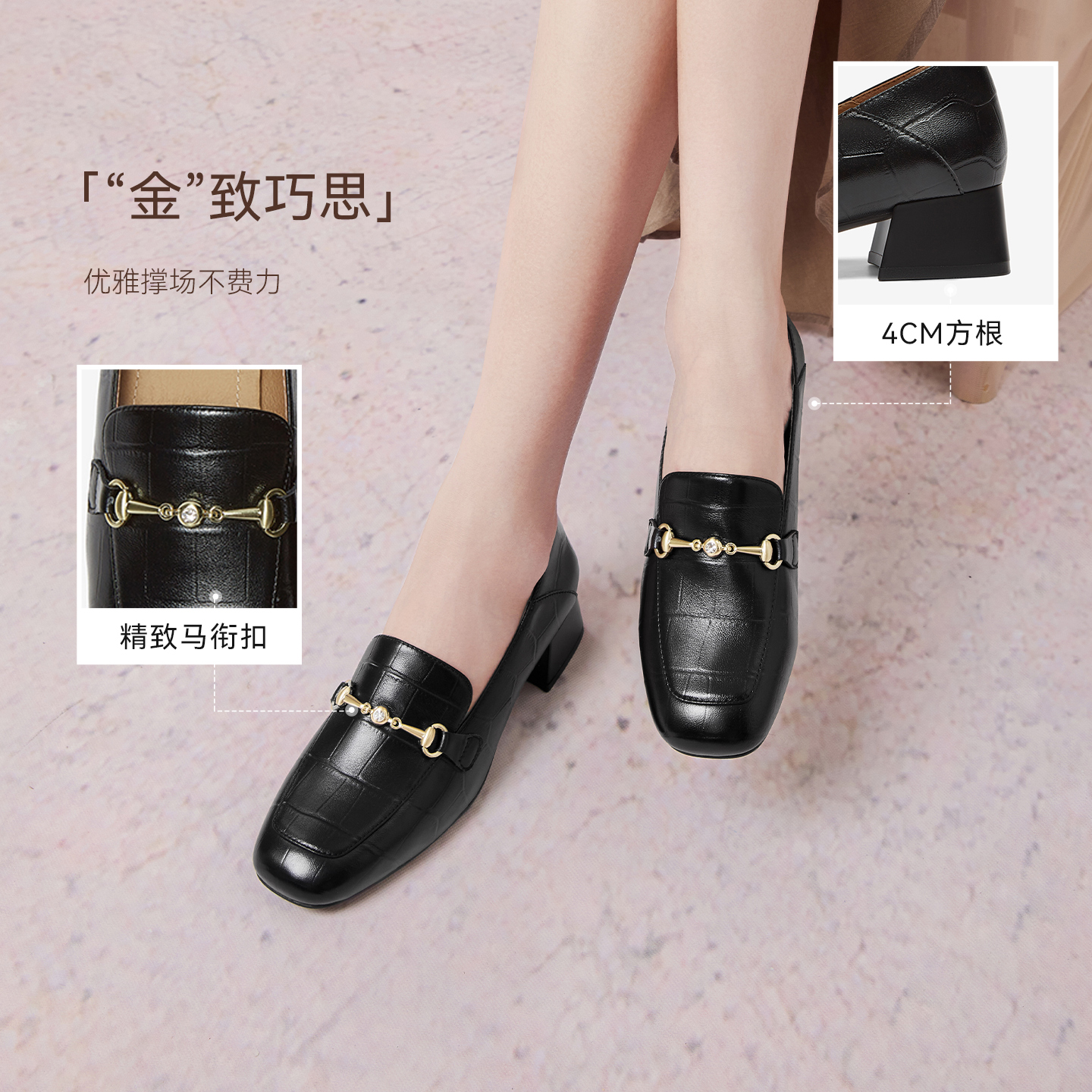 百思图2025秋新款复古羊皮乐福鞋皮鞋通勤粗跟方头女单鞋TL527CA5