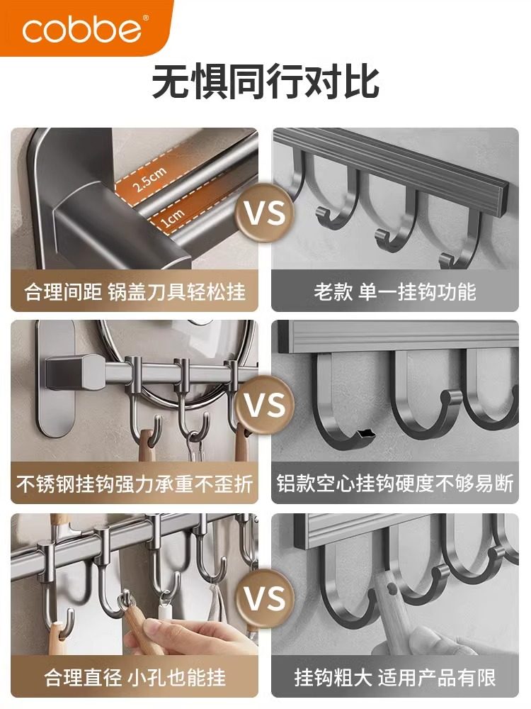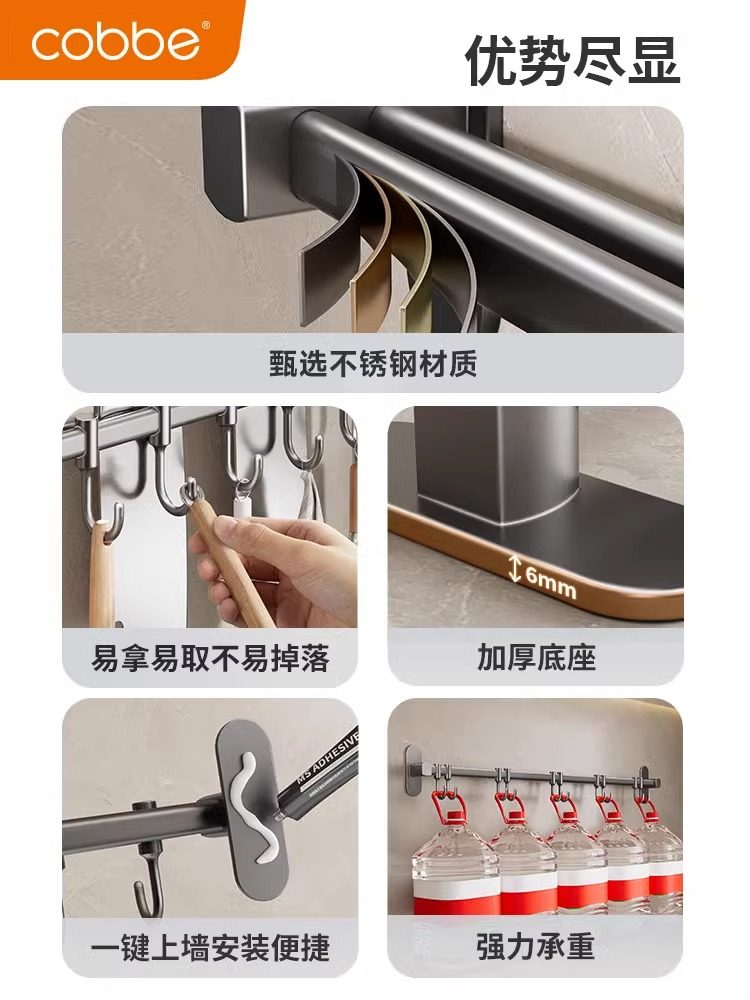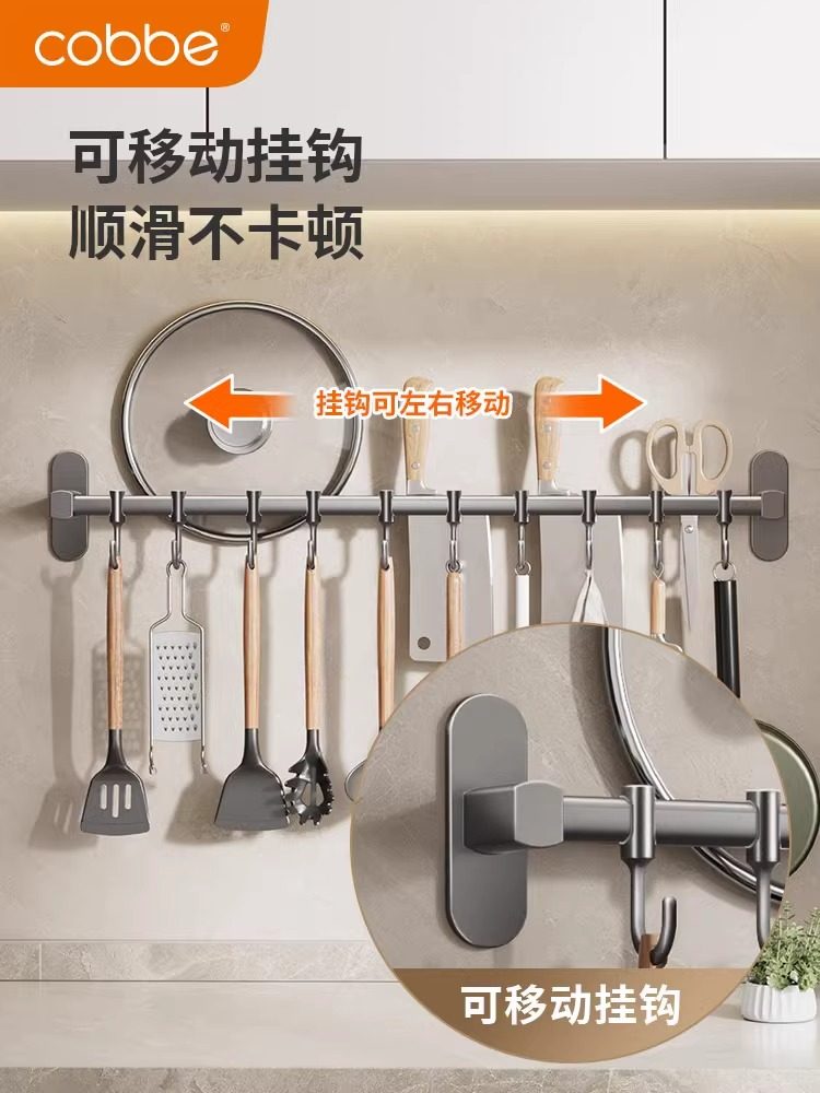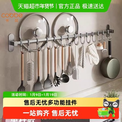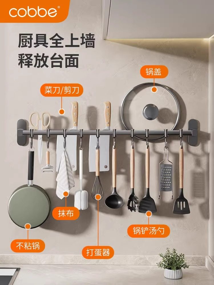 卡贝厨房壁挂置物架挂钩勺子铲子挂架不锈钢免打孔多功能挂杆收纳