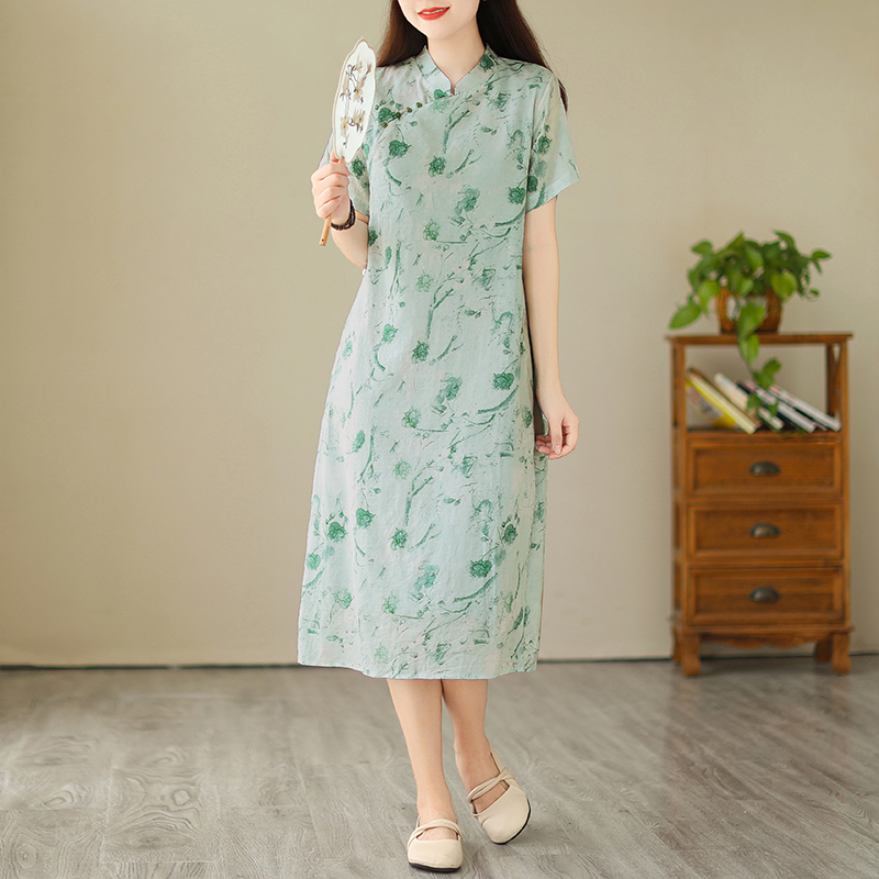 中式苎麻印花改良旗袍裙女夏2024新款复古斜襟珠扣棉麻立领连衣裙