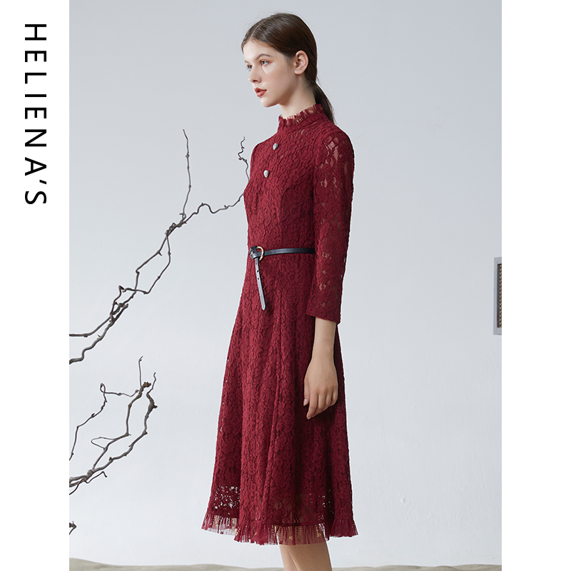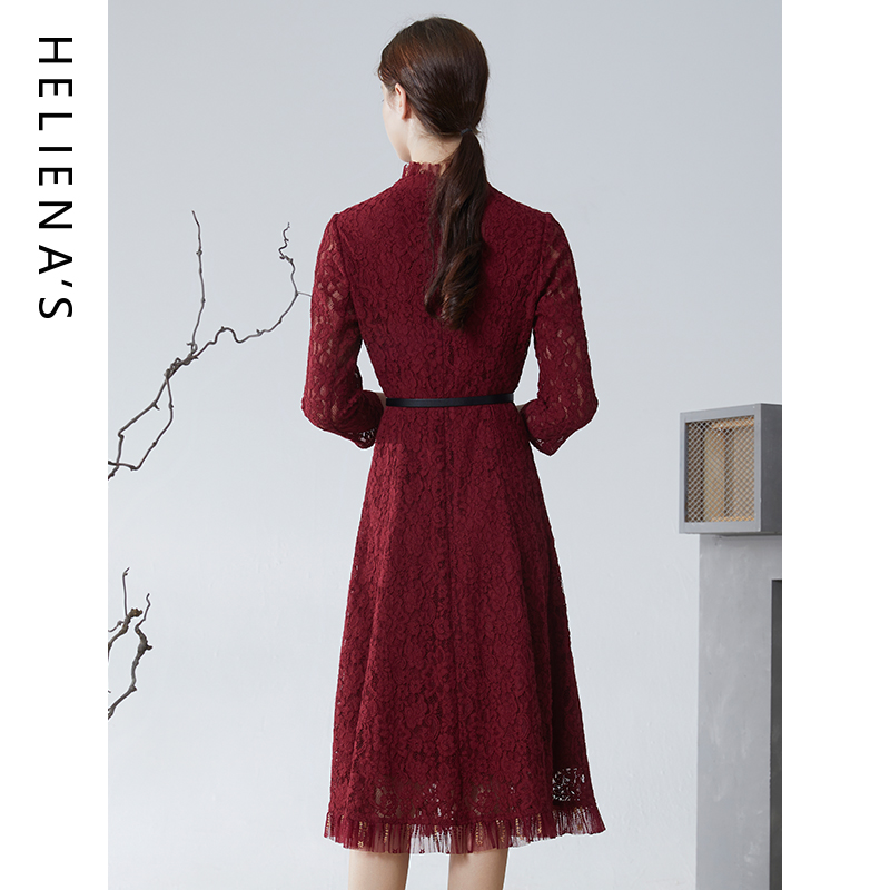 海兰丝春秋新款蕾丝长袖连衣裙女修身红色裙子名媛气质碎花长裙