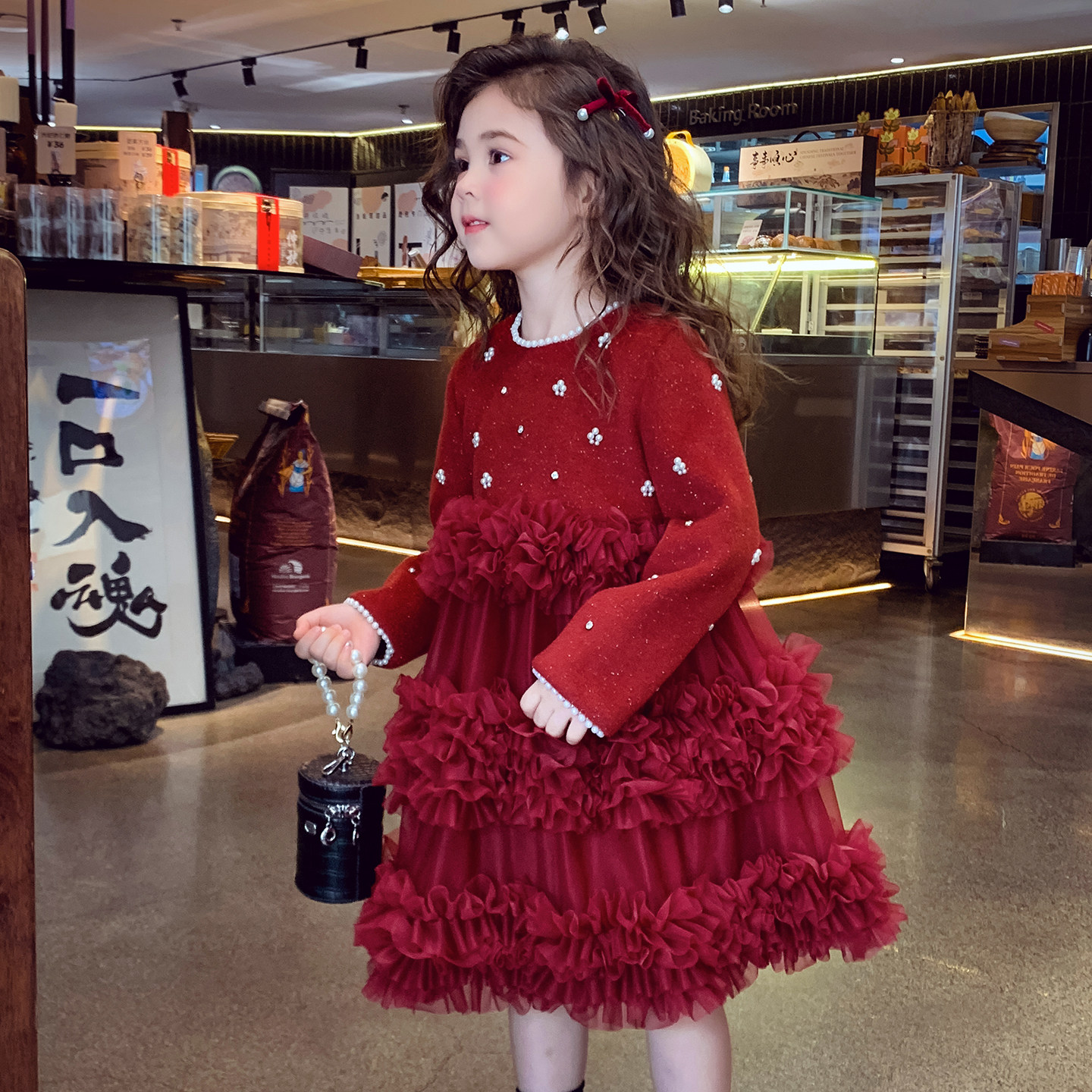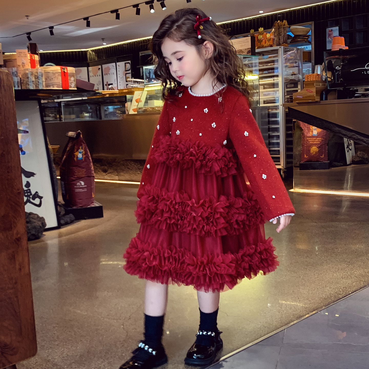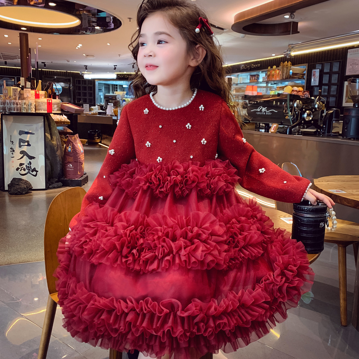 女童公主裙冬装2025新款儿童红色新年礼服女孩法式蓬蓬网纱连衣裙