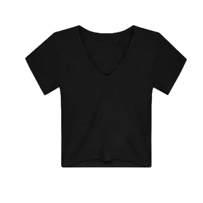 2025春夏季性感正肩V领短袖紧身纯欲风短款高腰辣妹低领上衣t恤女