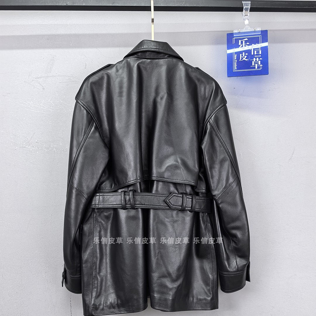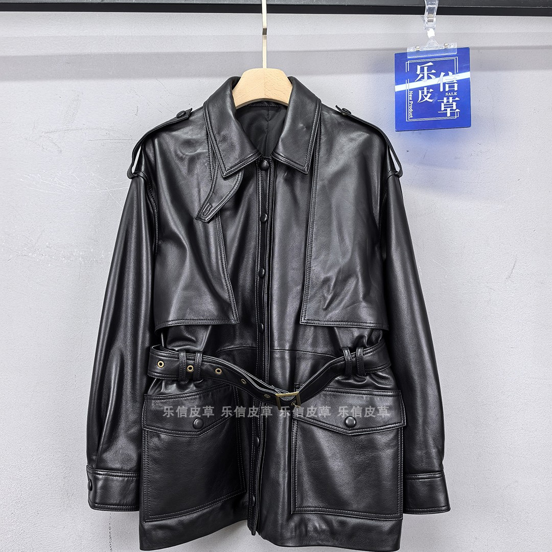 时尚新款真皮皮衣女单排扣系带收腰中长款绵羊皮修身显瘦复古外套