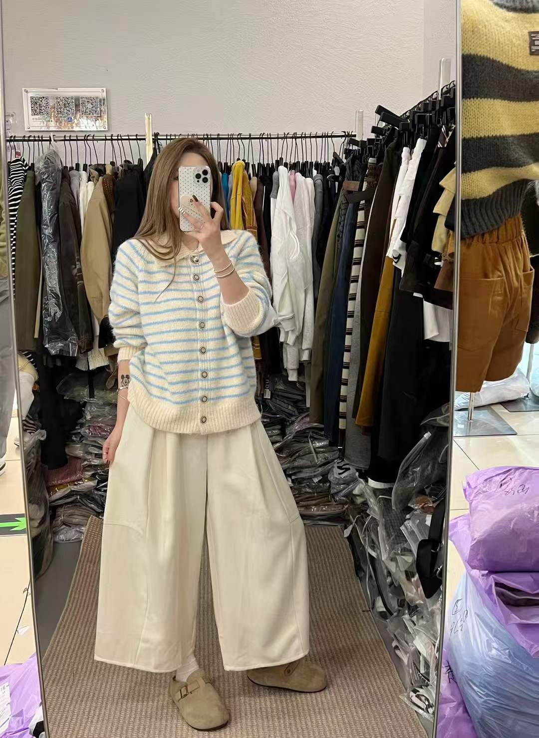 Miss家韩版翻领撞色条纹短款针织开衫女2025秋冬新款宽松百搭毛衣