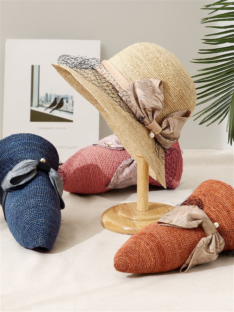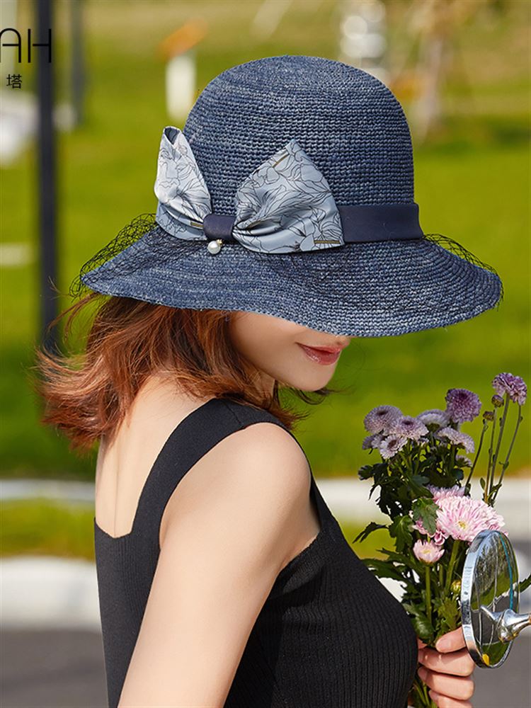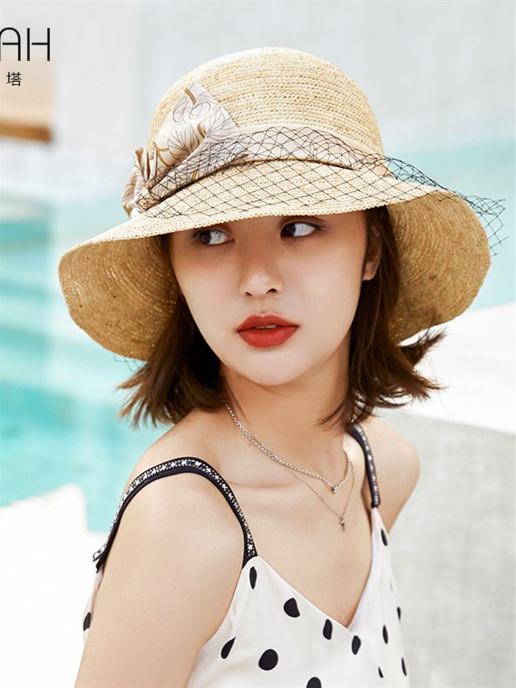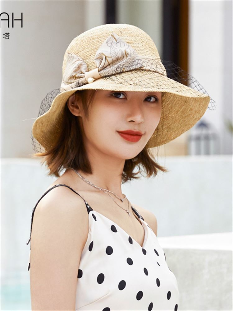 布塔夏季草帽女拉菲草大檐度假沙滩帽时尚蕾丝网纱防晒草编遮阳帽