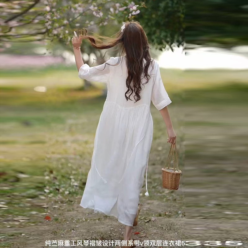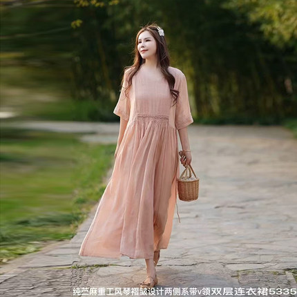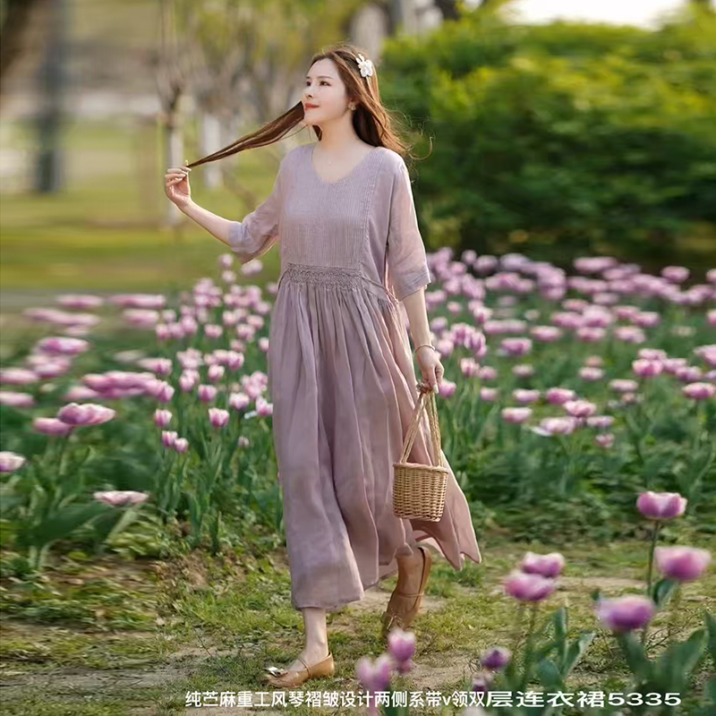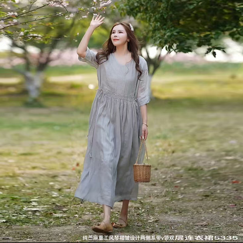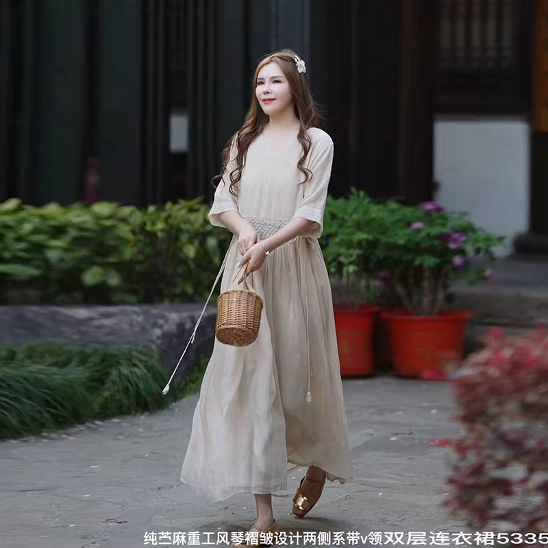 2025夏新款V领纯色高端苎麻双层连衣裙两侧收腰显瘦长裙气质文艺