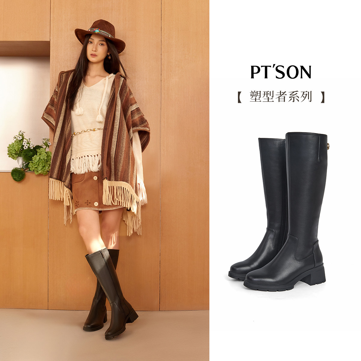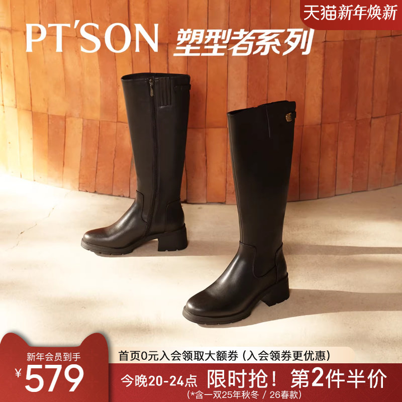 百田森真皮复古骑士靴女新款女烟筒靴长靴西部牛仔靴高筒靴皮带扣