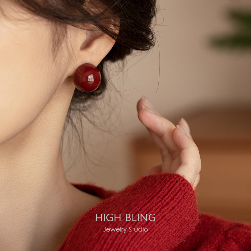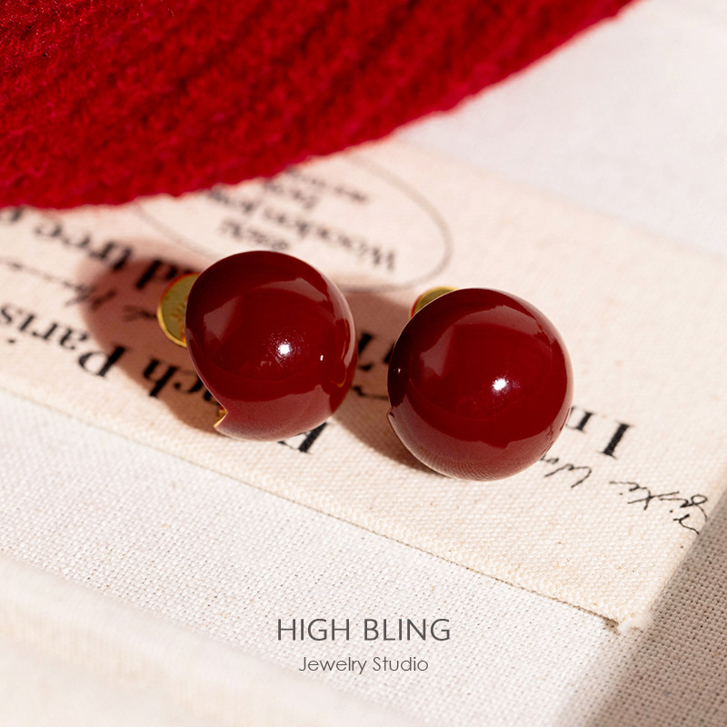 超显白方圆脸复古红车厘子中古珐琅球耳饰无耳洞女蚊香盘耳夹港风