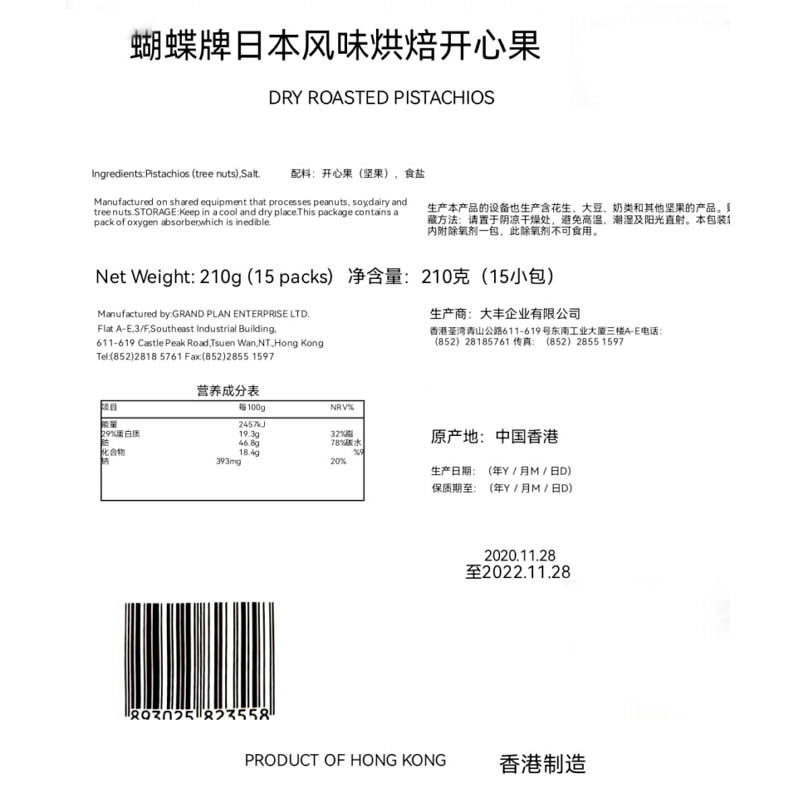 香港进口蝴蝶牌精选日本风味烘培开心果210g(15小包)坚果果仁食品