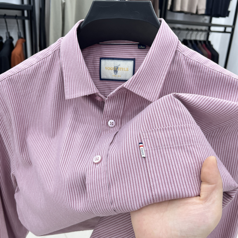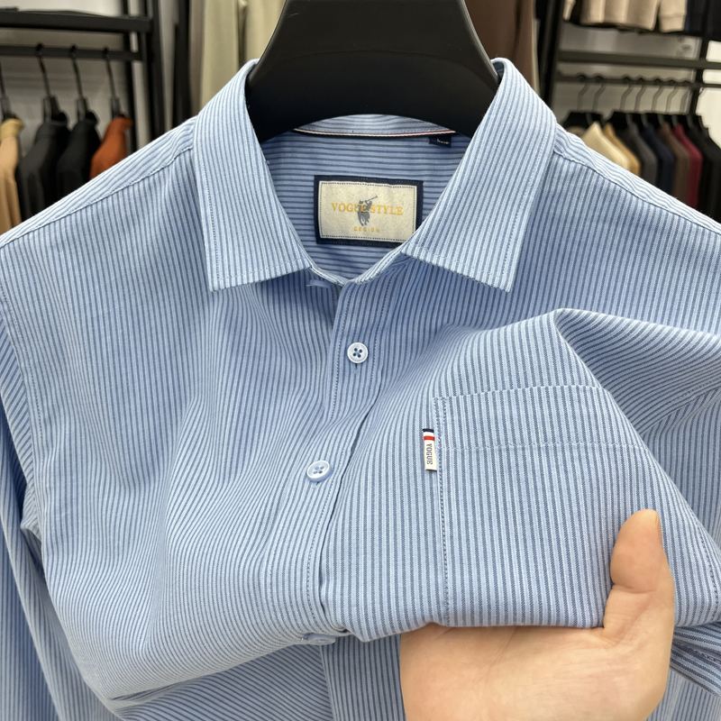 带口袋外贸衬衫男长袖2024新款春秋商务休闲中青年男士竖条纹衬衣