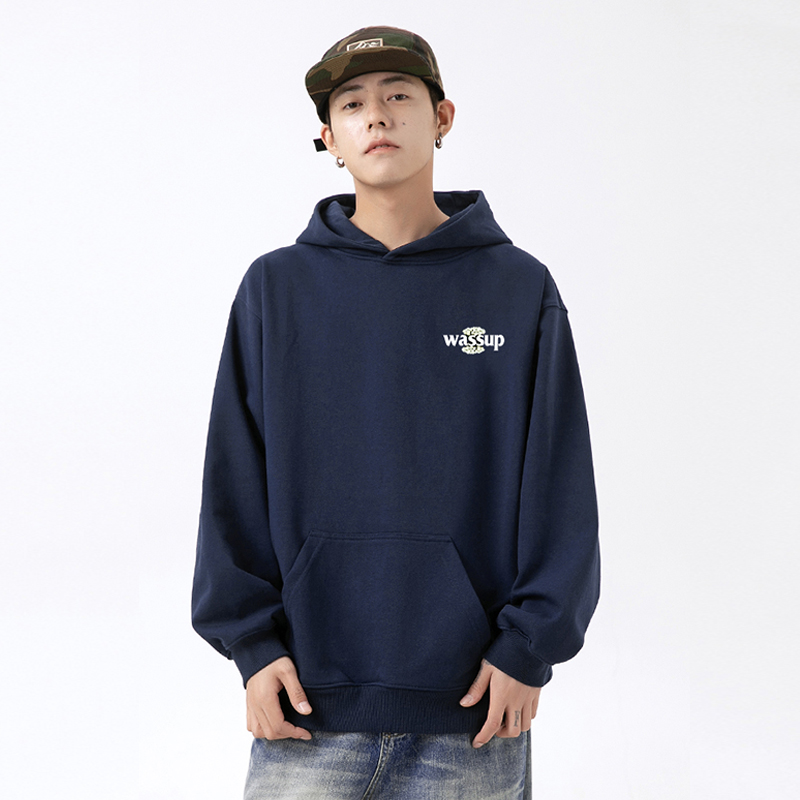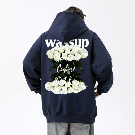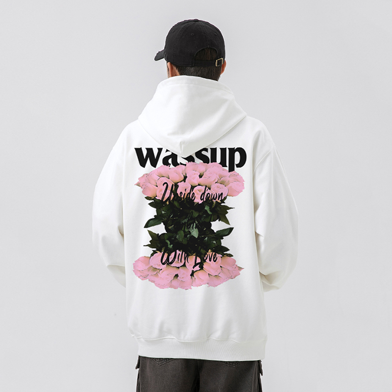 WASSUP白玫瑰花语重磅美式卫衣男连帽秋冬季加绒国潮宽松套头上衣