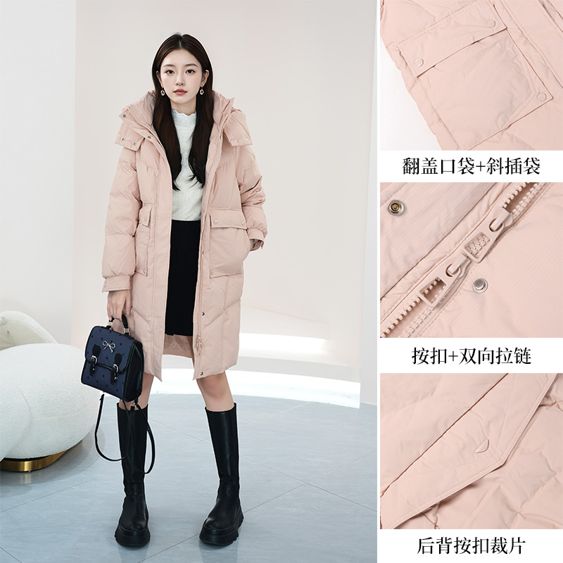 朵以2025冬季新款休闲时尚多口袋鸭绒中长款连帽羽绒服保暖外套女