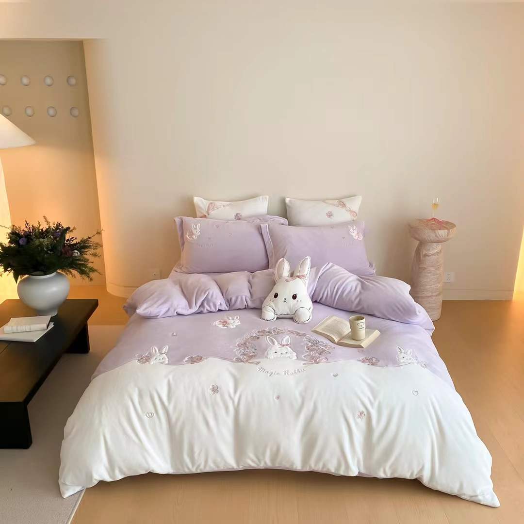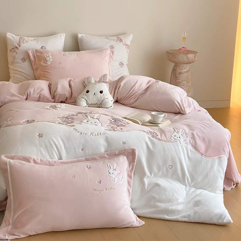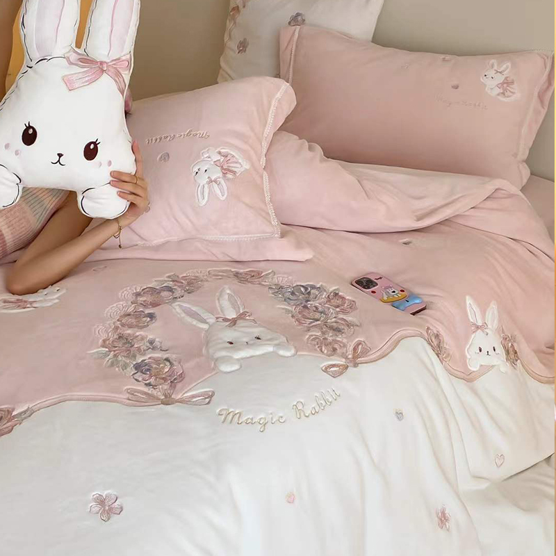 冬季卡通少女心加厚牛奶绒四件套可爱兔珊瑚绒被套儿童床笠三件套