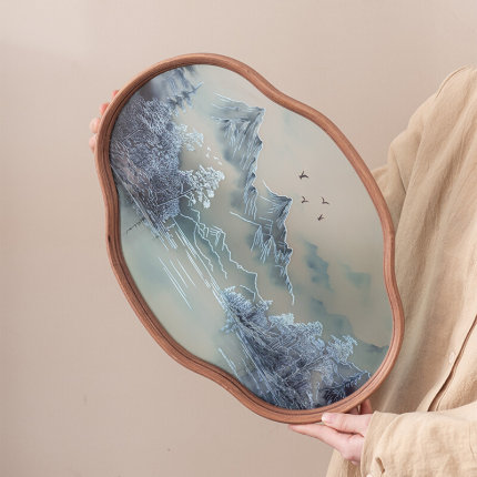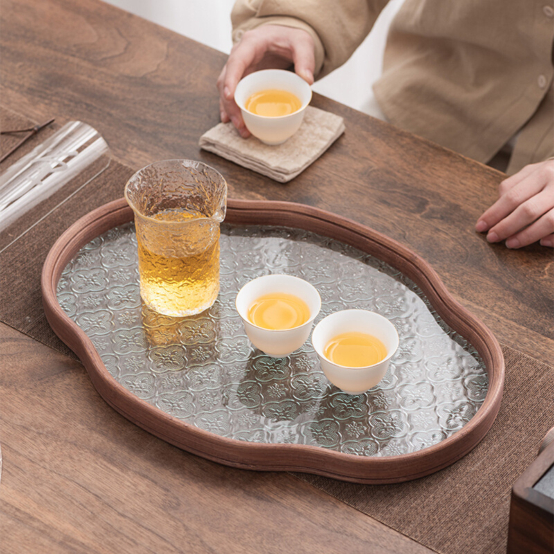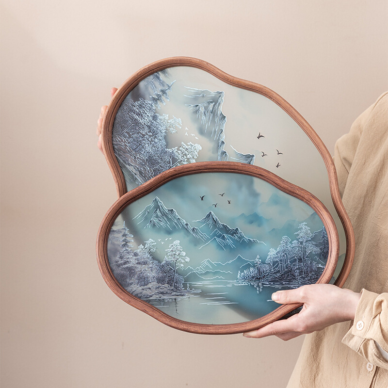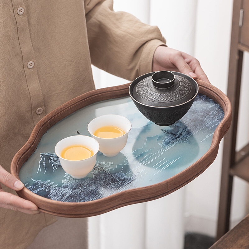 轻奢新款寒江雪山水茶盘玻璃海棠托盘小中式竹制干泡盘家用收纳盘