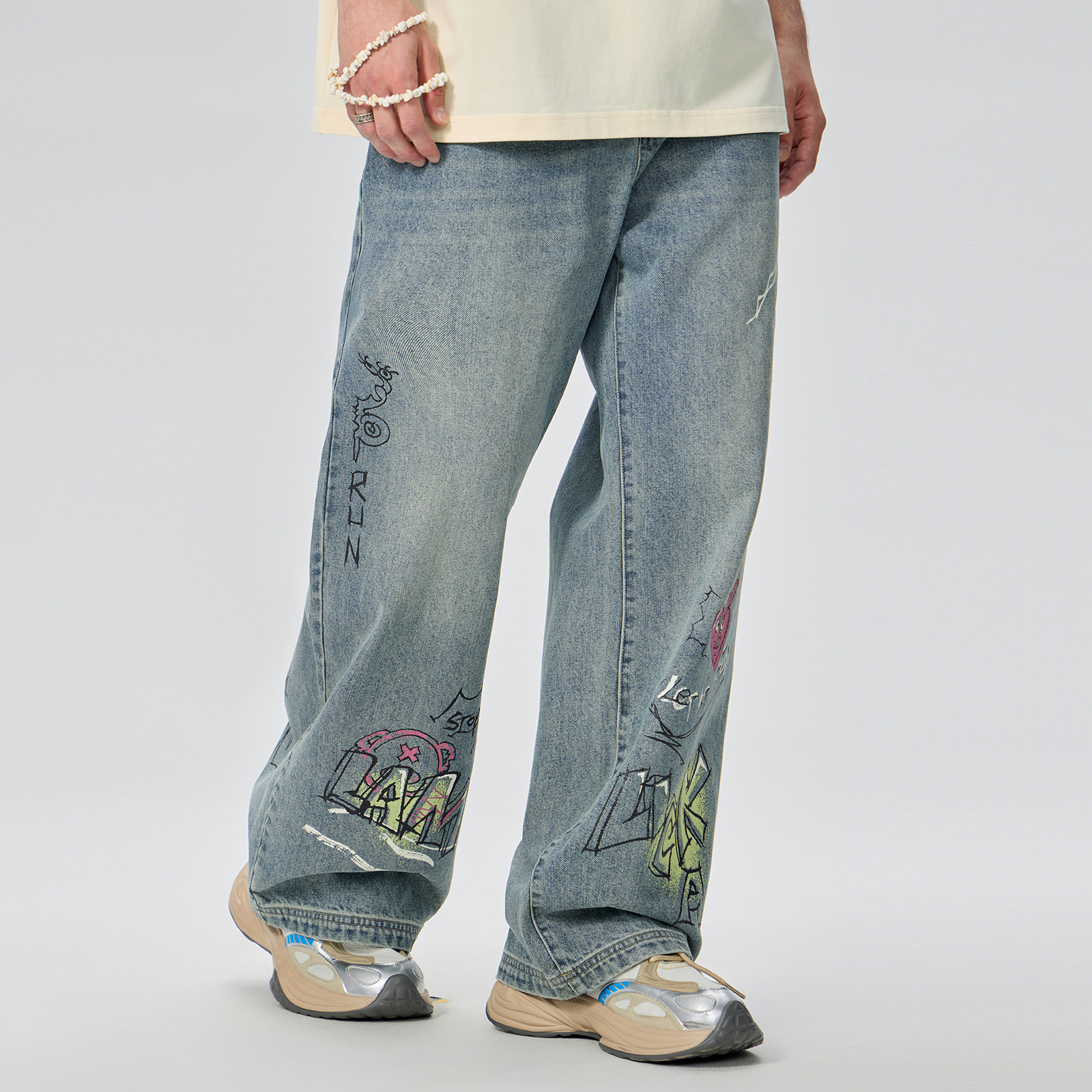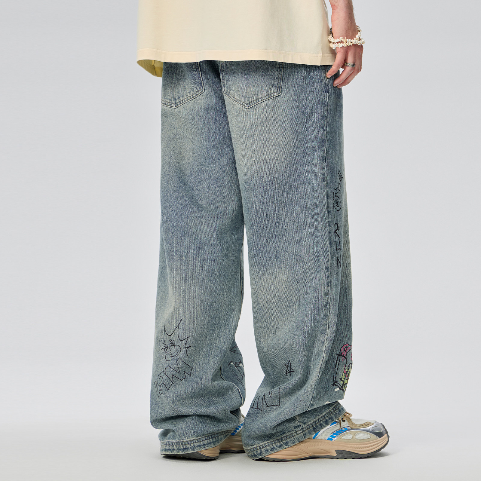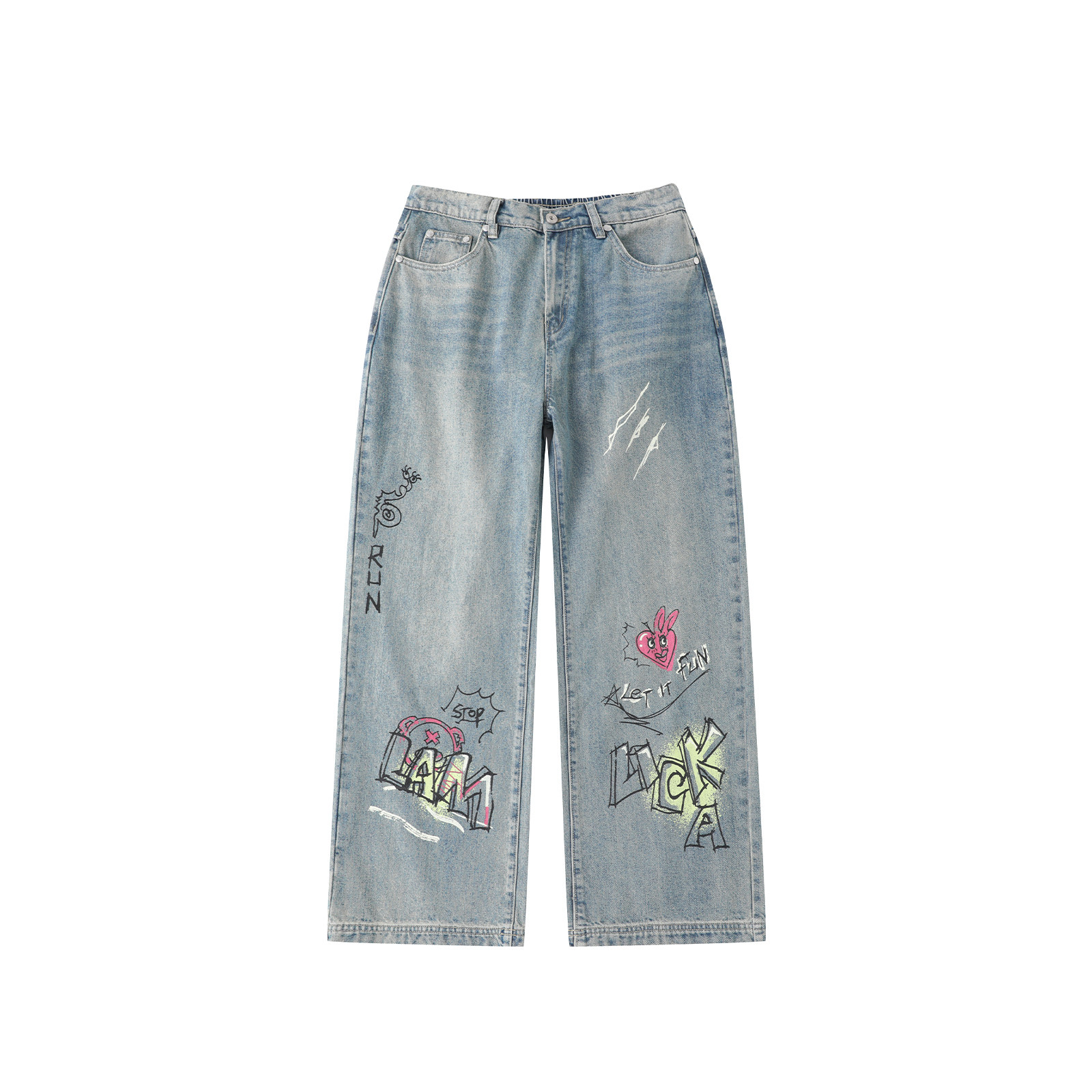 LAMLICKA原创涂鸦水洗蓝色直筒牛仔裤男春季新款垂感宽松休闲长裤