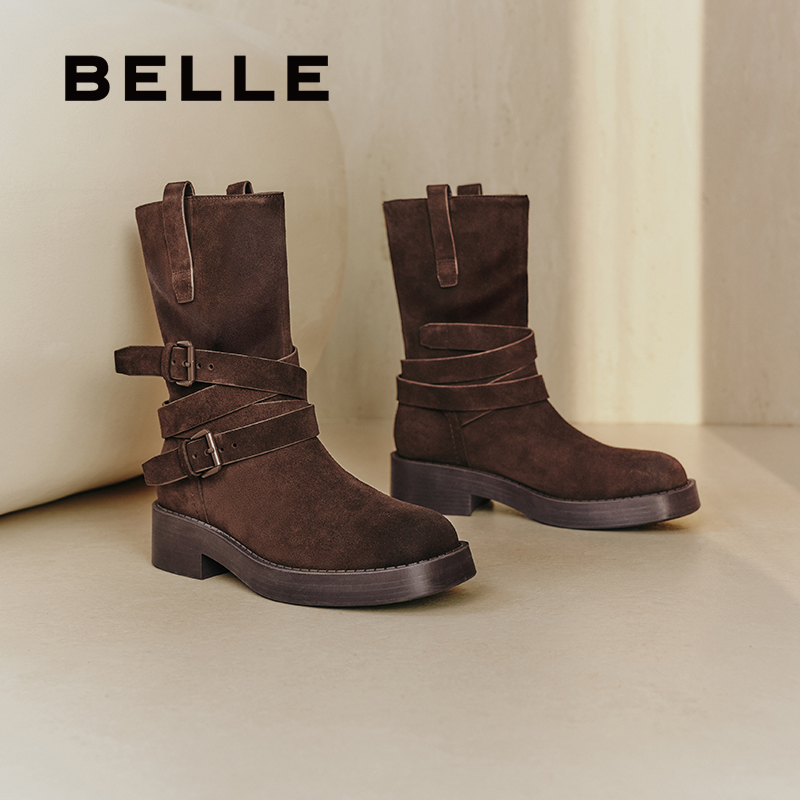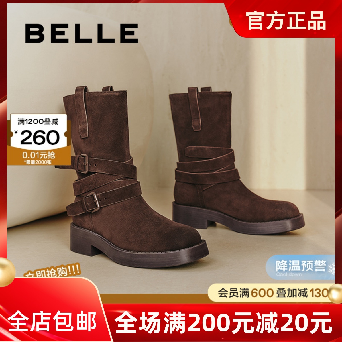 专柜正品百丽2024冬款女靴西部靴真皮短靴堆堆靴马丁靴D1Z1DDZ4