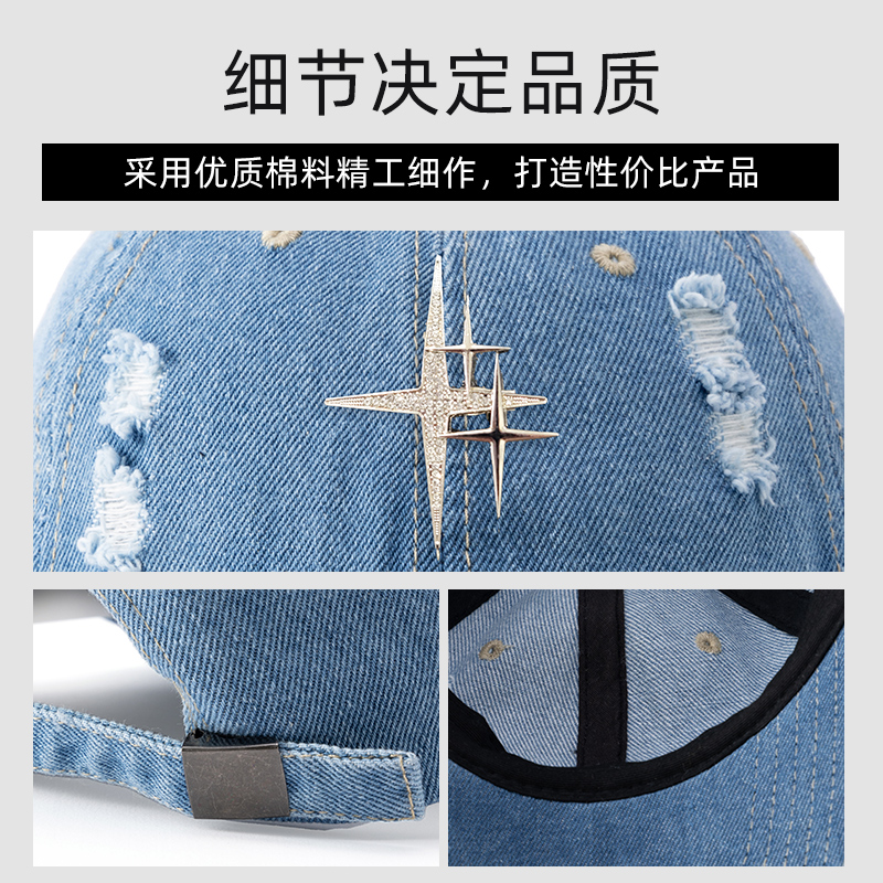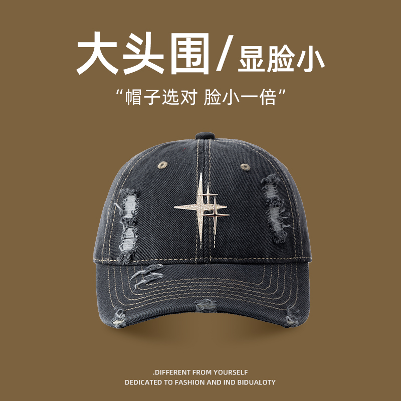 美式复古做旧棒球帽女大头围水洗破洞牛仔宽帽檐鸭舌帽显脸小帽子