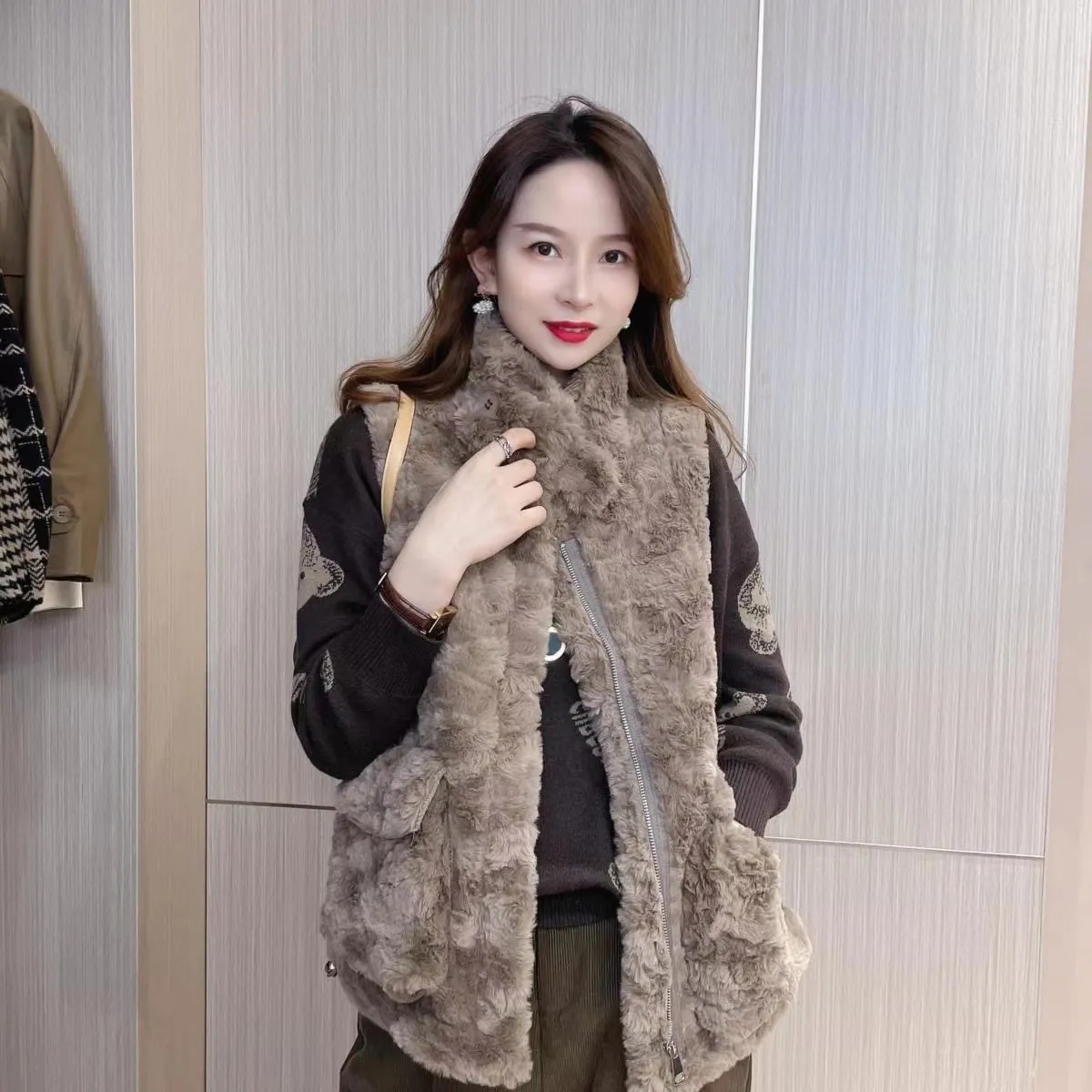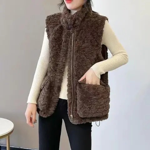 韩版纯色羊羔毛一体大口袋马甲女秋冬季2025新款百搭毛绒坎肩外套