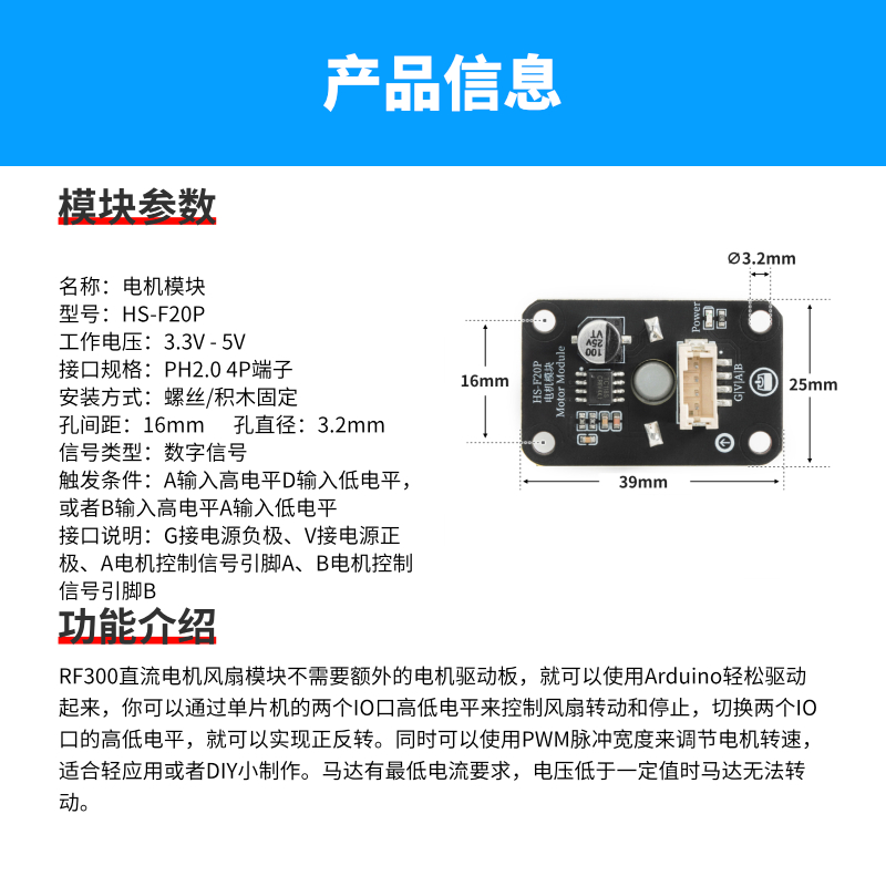 兼容Arduino直流电机驱动正反转电机PWM调速小风扇模块 PH2.0-4p
