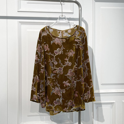 高端新中式国风印花真丝绒衬衫女2025秋新款优雅气质宽松遮肉上衣