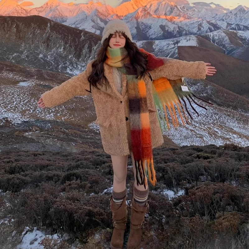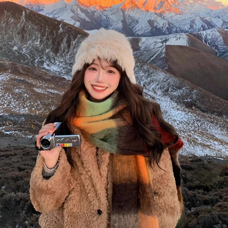 日本品质彩虹围巾女秋冬季羊绒格子百搭披肩高级感加厚保暖围脖