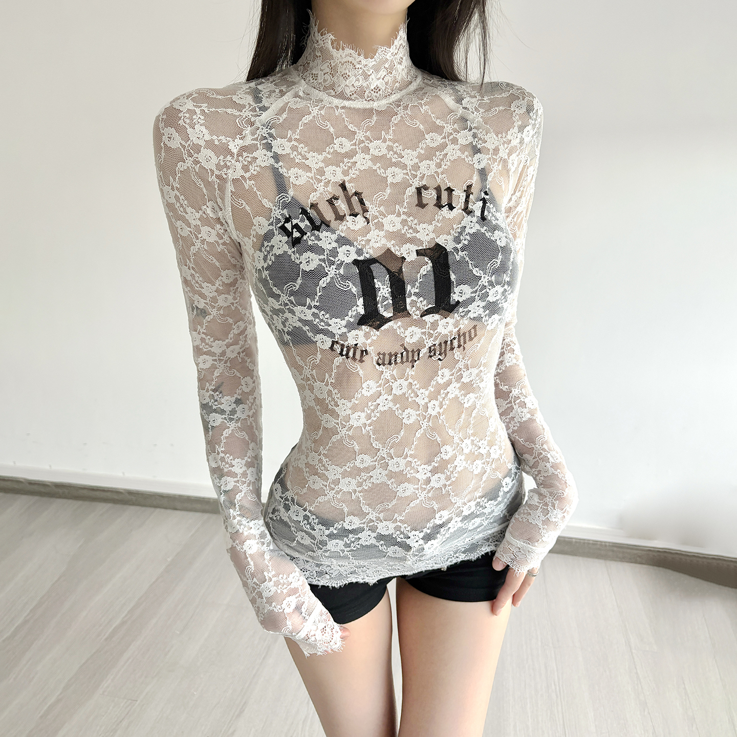 AOMR 纯欲轻薄透视蕾丝字母印花打底衫上衣女性感紧身高领长袖T恤