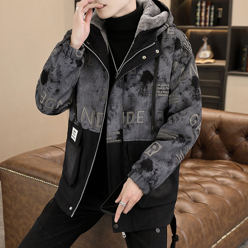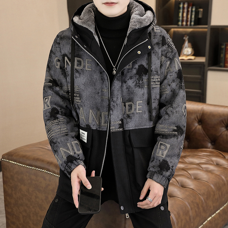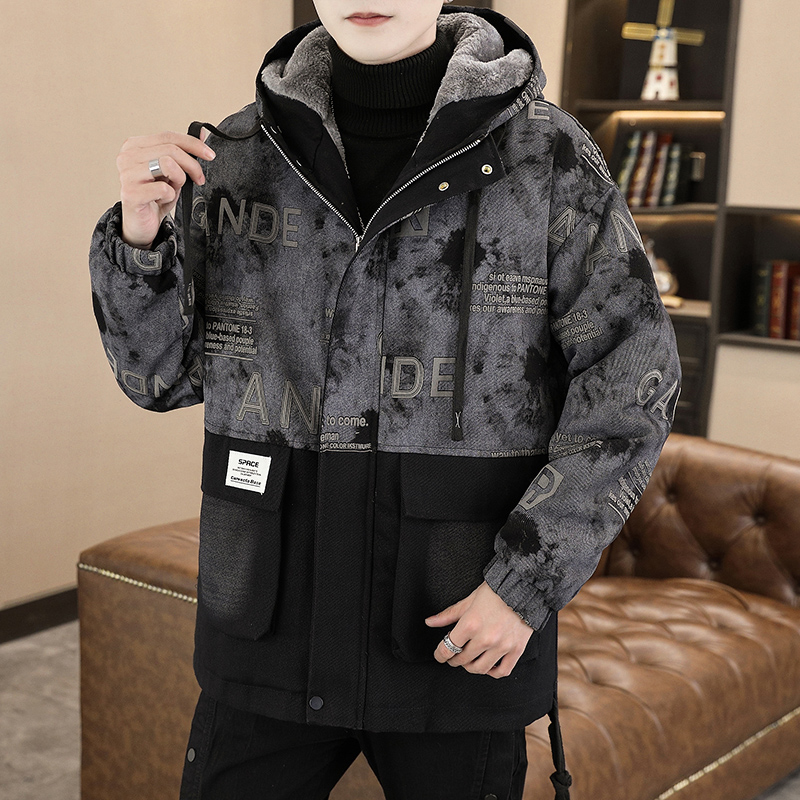 加绒加厚棉衣男2025冬季新款牛仔外套男孩青少年潮牌保暖派克棉服