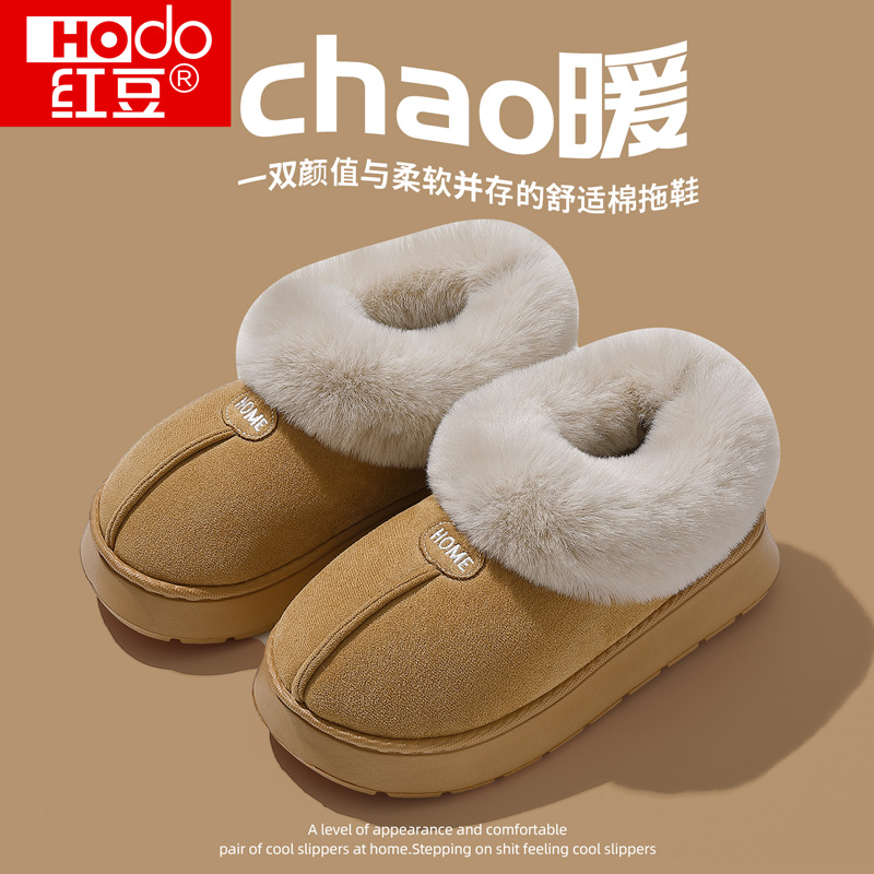 红豆厚底棉拖鞋女士2025新款冬季室内防滑耐磨加绒包跟保暖毛毛鞋