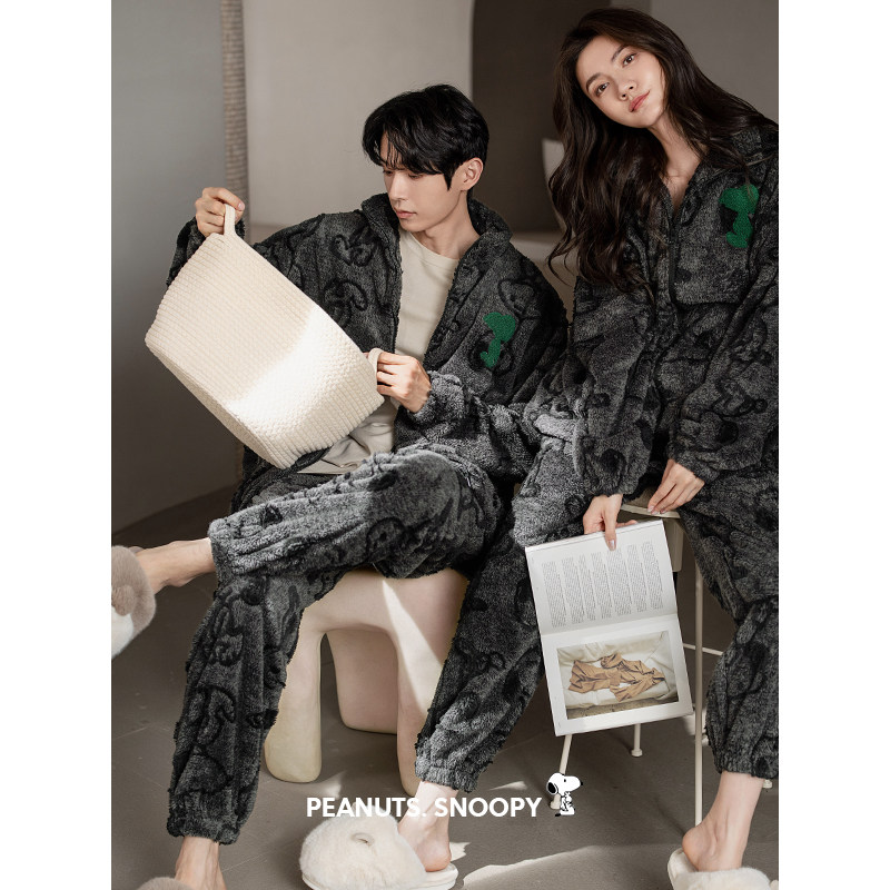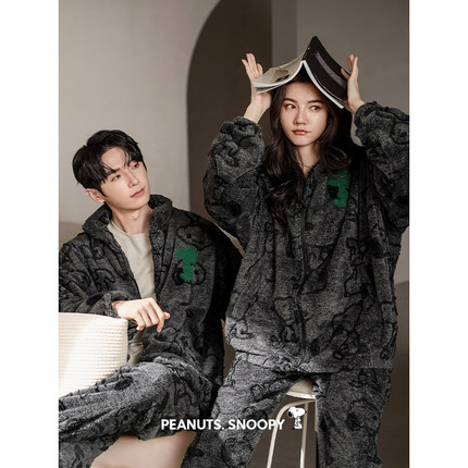 贝妍史努比情侣睡衣女秋冬加厚珊瑚绒家居服男大码保暖法兰绒套装