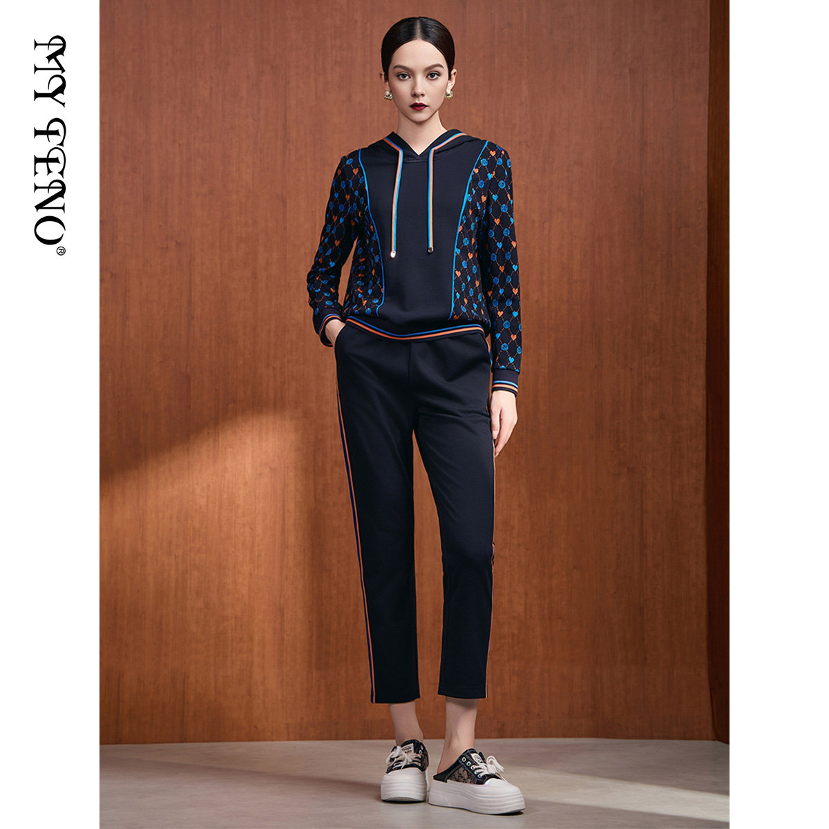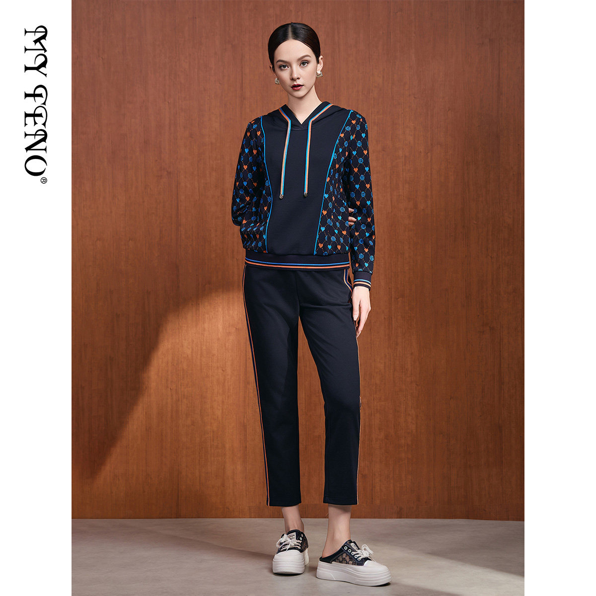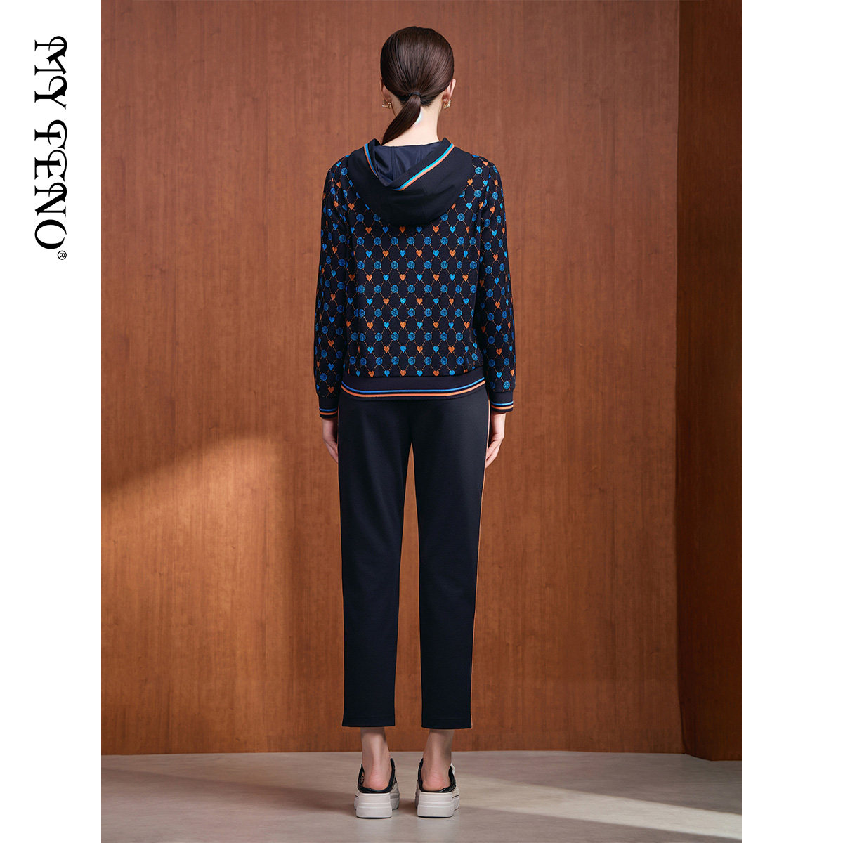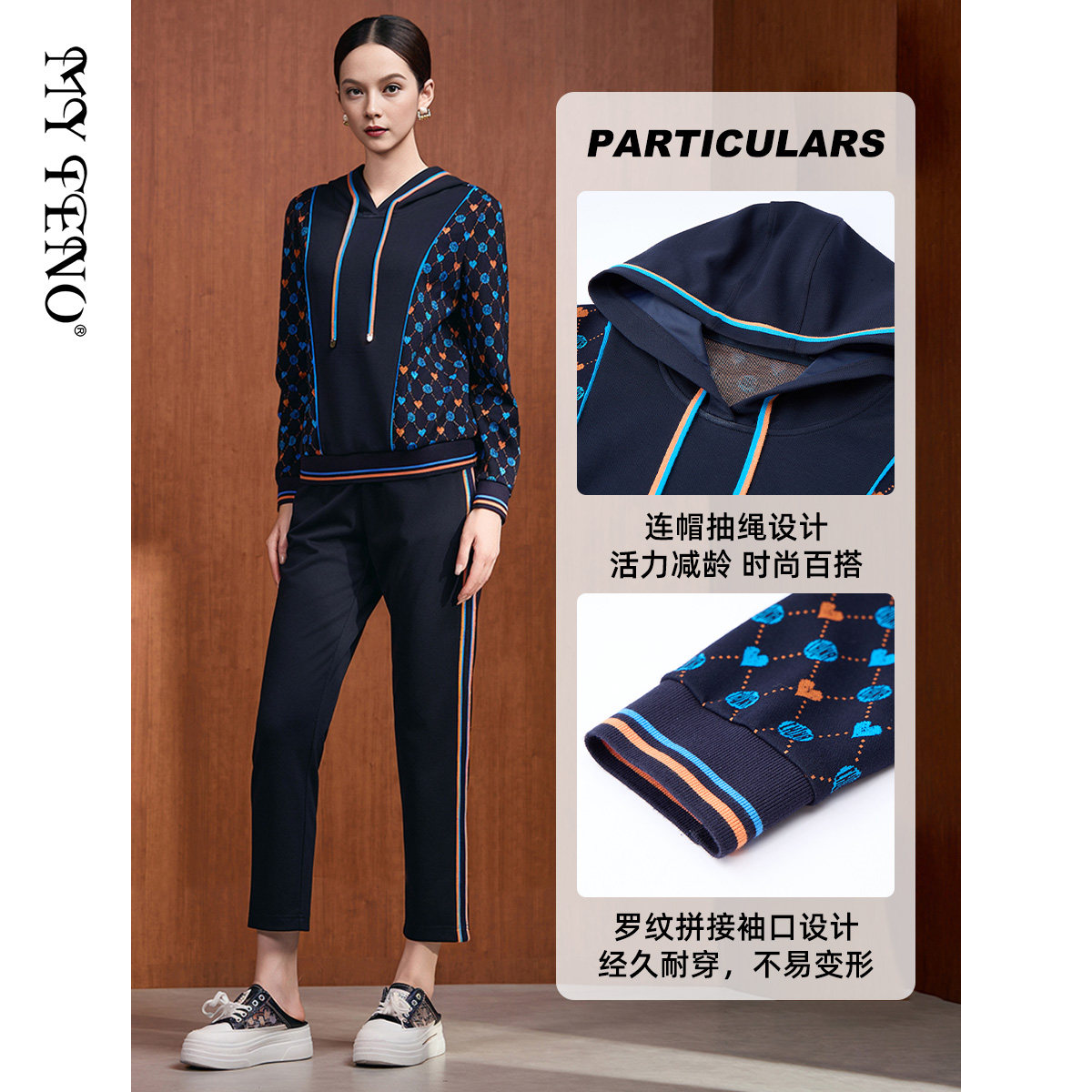 马天奴女装春夏新款时尚套装针织提花连帽卫衣上衣松紧腰休闲裤子