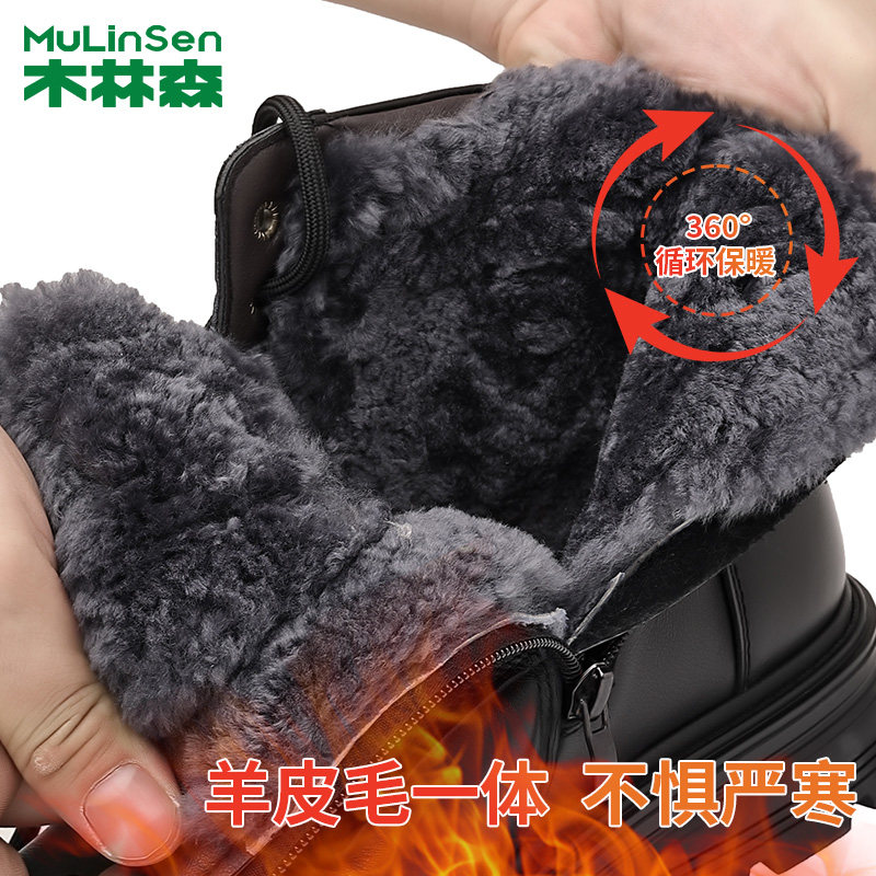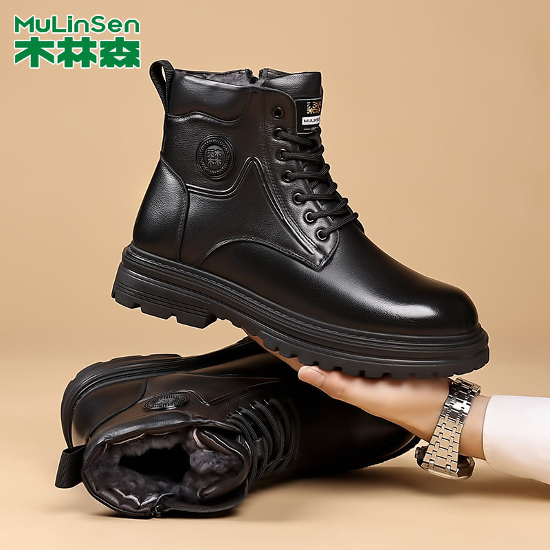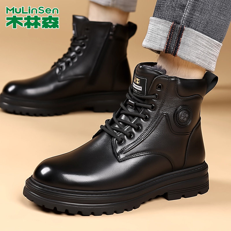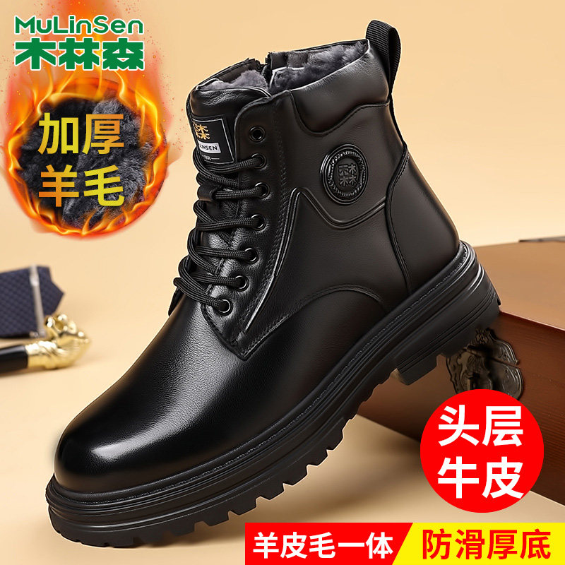 木林森高帮马丁靴男冬季新款加绒保暖羊皮毛一体时尚英伦机车靴子
