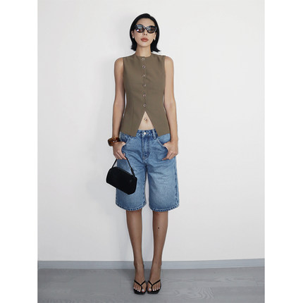VanessaLab 夏季复古水洗蓝色牛仔短裤女休闲百搭直筒宽松五分裤