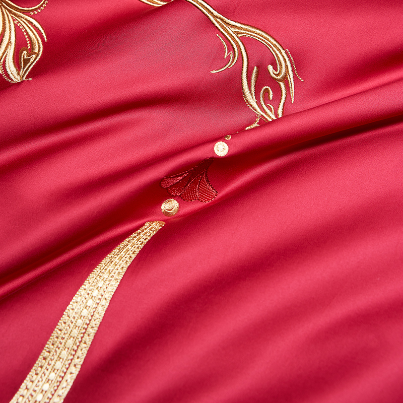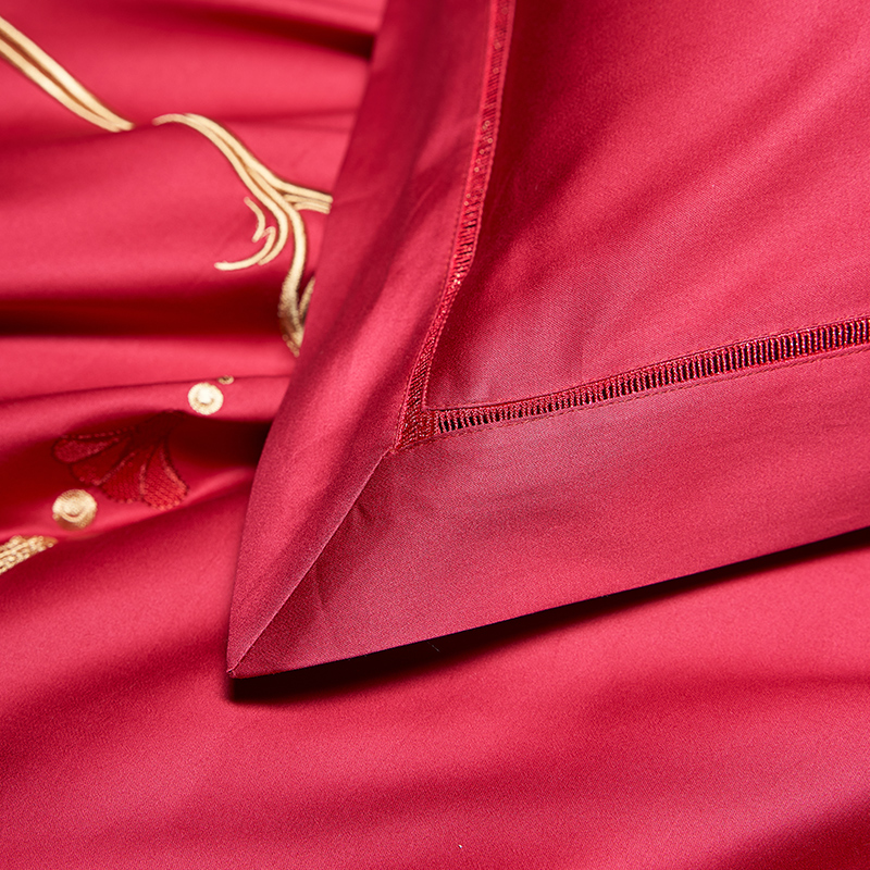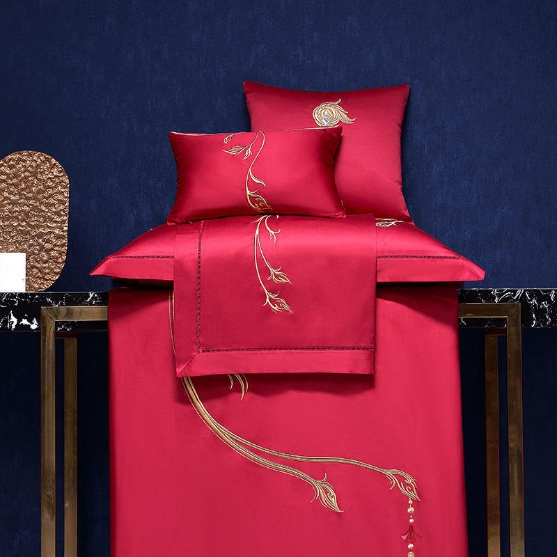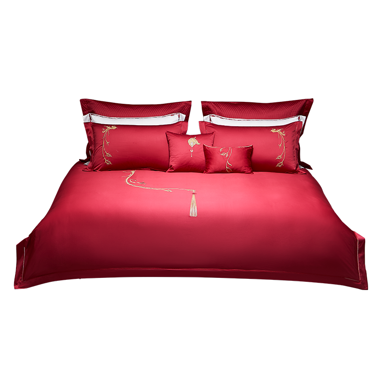罗莱家纺100支婚庆床单大红色全棉贡缎床上用品结婚四件套喜被
