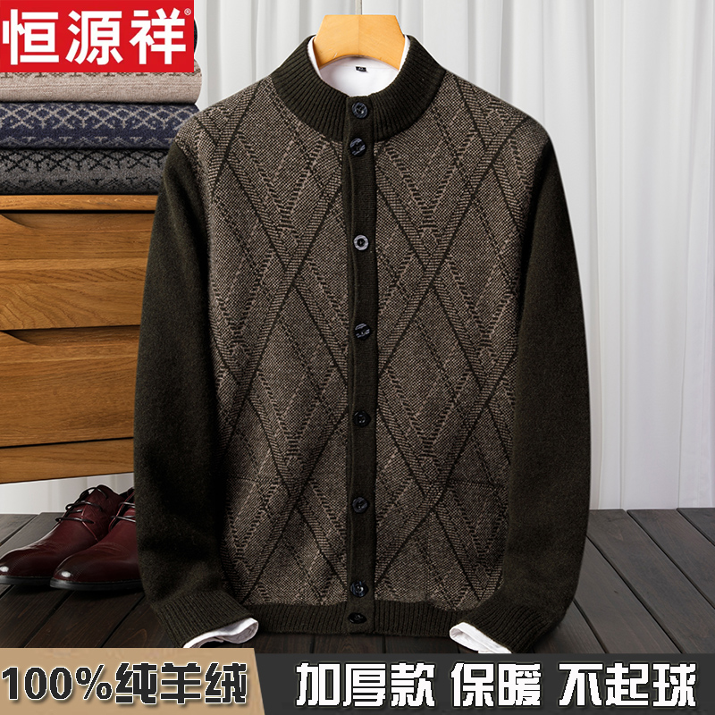 恒源祥100%纯羊绒衫男士外套冬季加厚针织开衫中老年山羊绒毛衣男