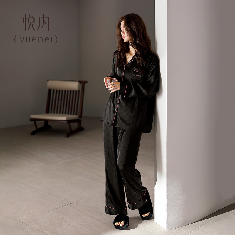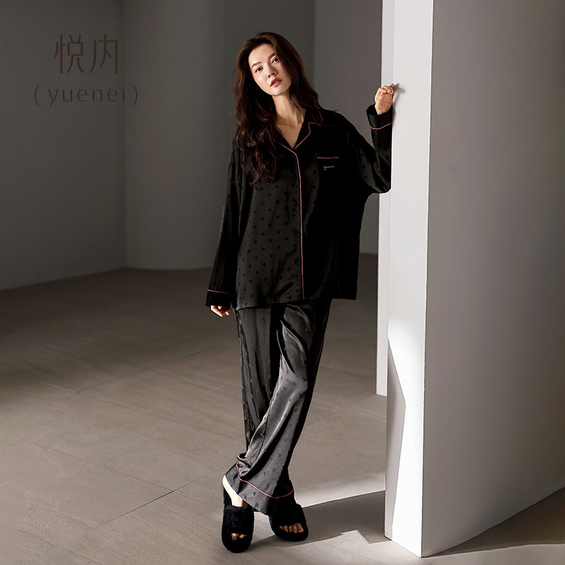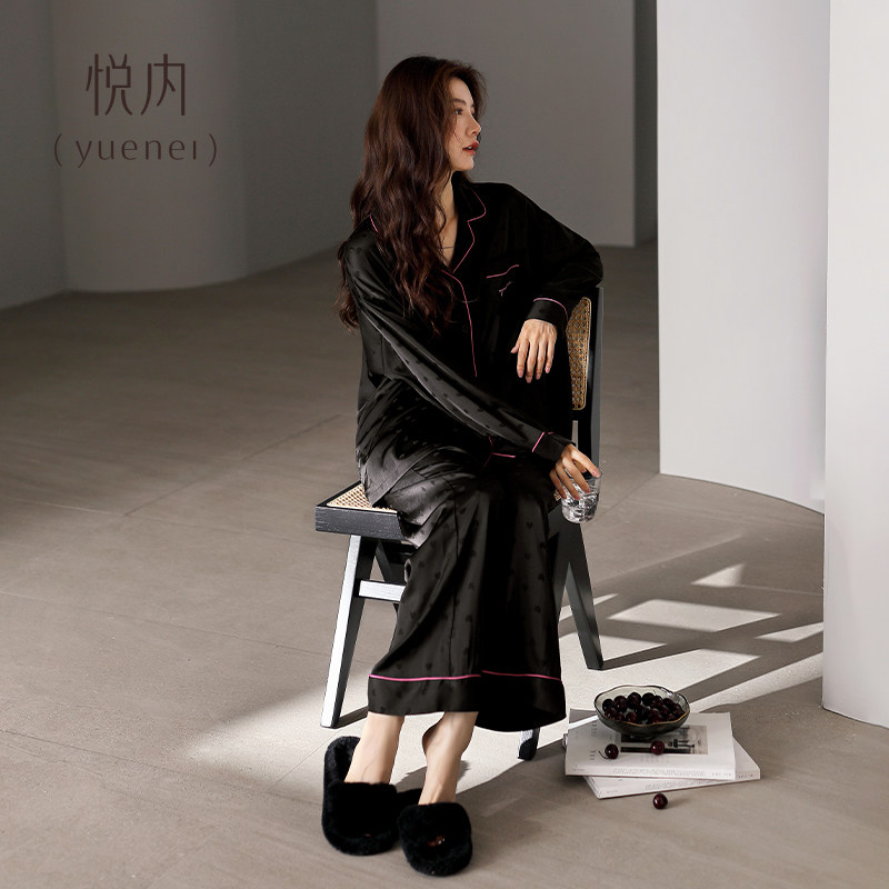 悦内睡衣女款春秋季秋款长袖冰丝绸家居服夏季黑色轻奢风高级感