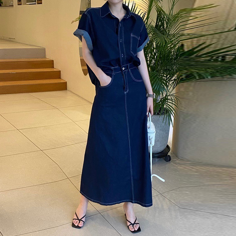 韩国chic夏季法式复古翻领短袖牛仔衬衫+高腰显瘦包臀半身裙套装