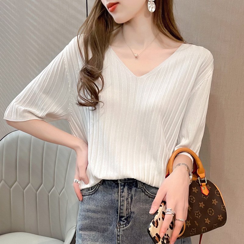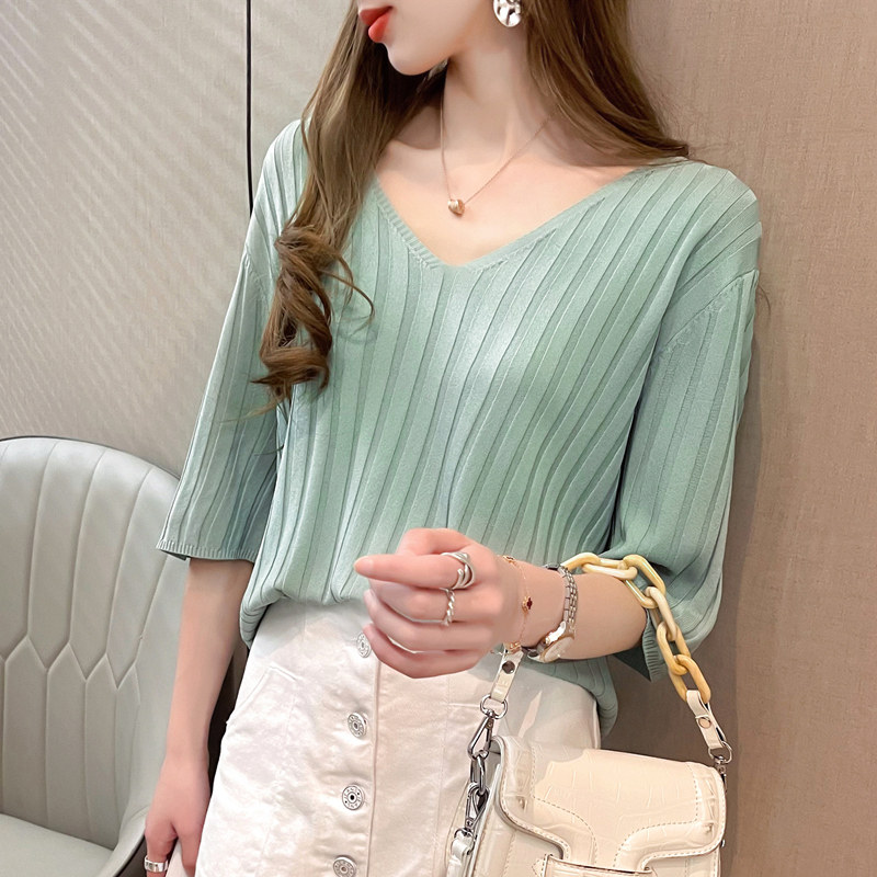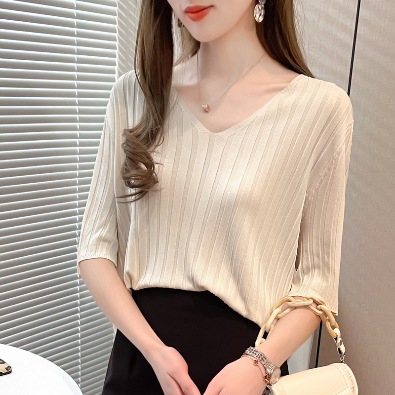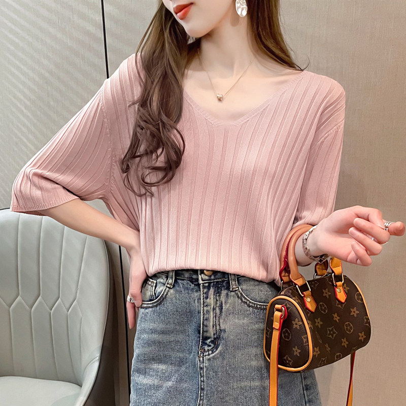 2025春夏新款轻薄冰丝冰麻针织衫中袖V领内搭上衣套头纯色薄款女