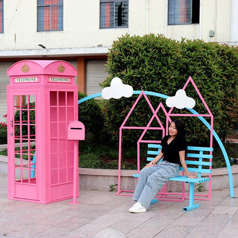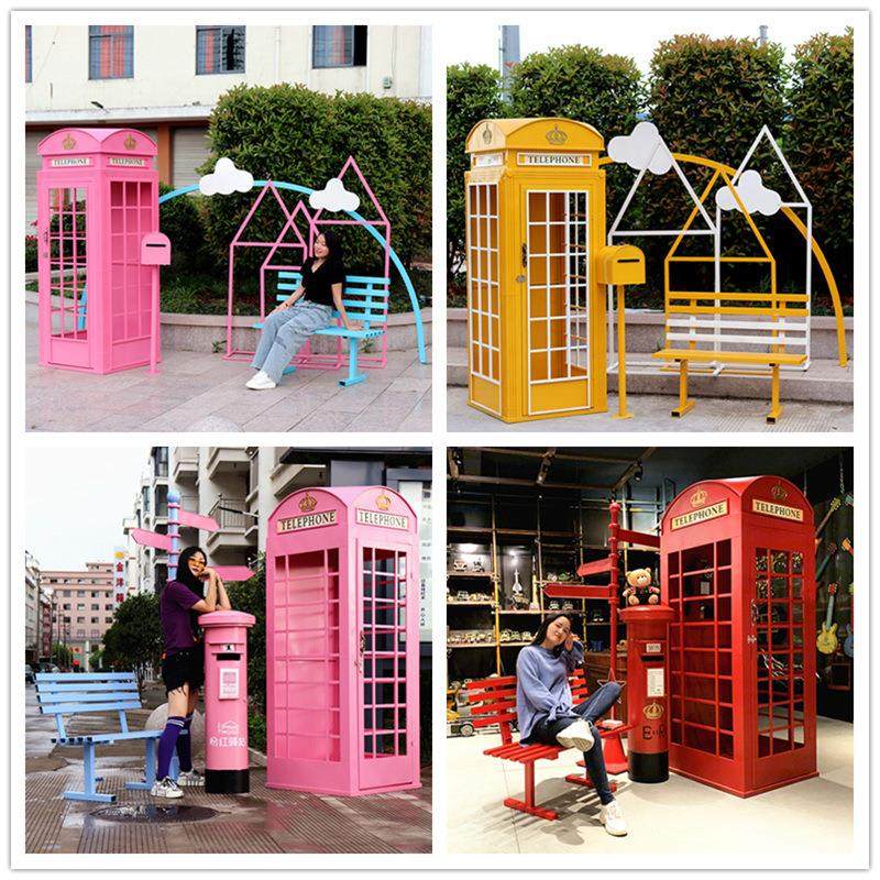 复古铁艺粉色邮筒电话亭储物柜路标指示牌大型拍摄道具网红店装饰