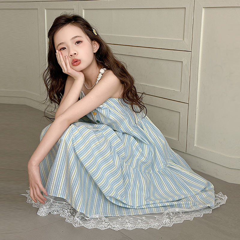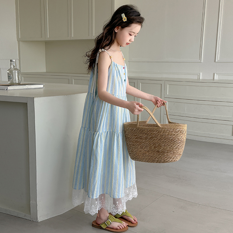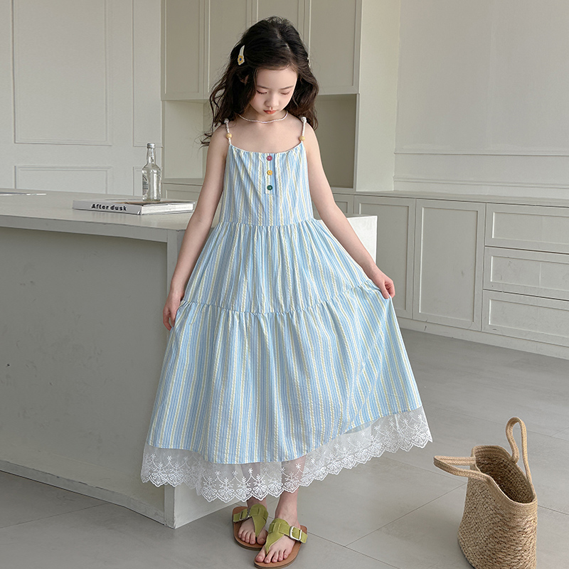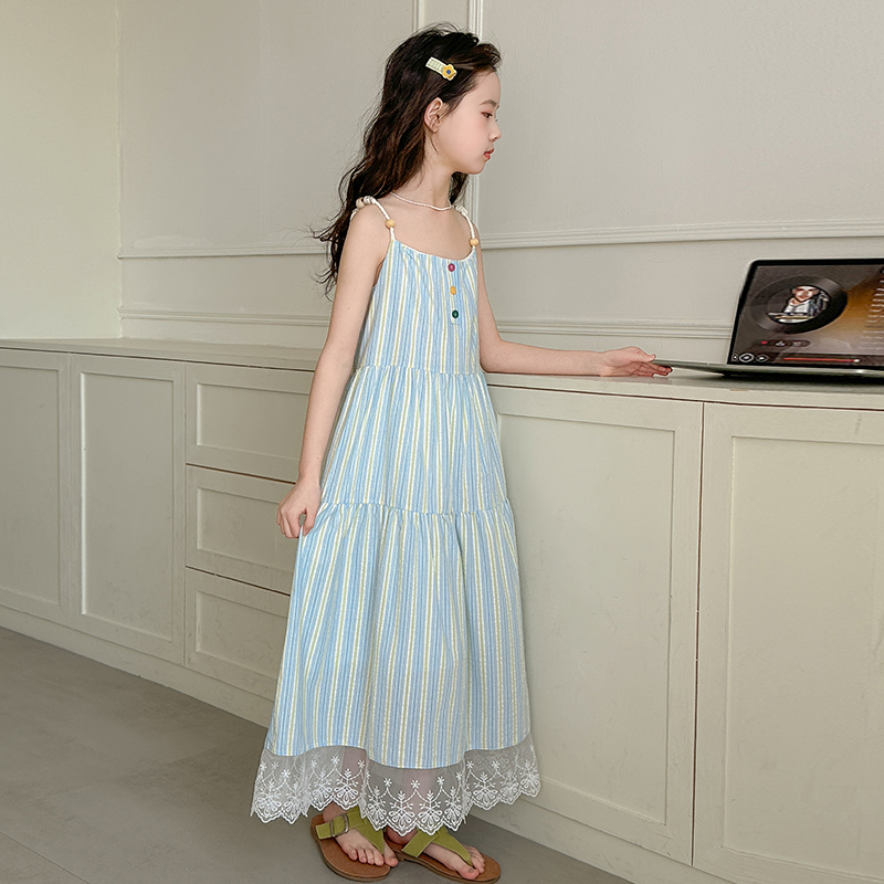 女童蓝色条纹连衣裙夏季2025新款中大童法式花边吊带裙透气棉布裙