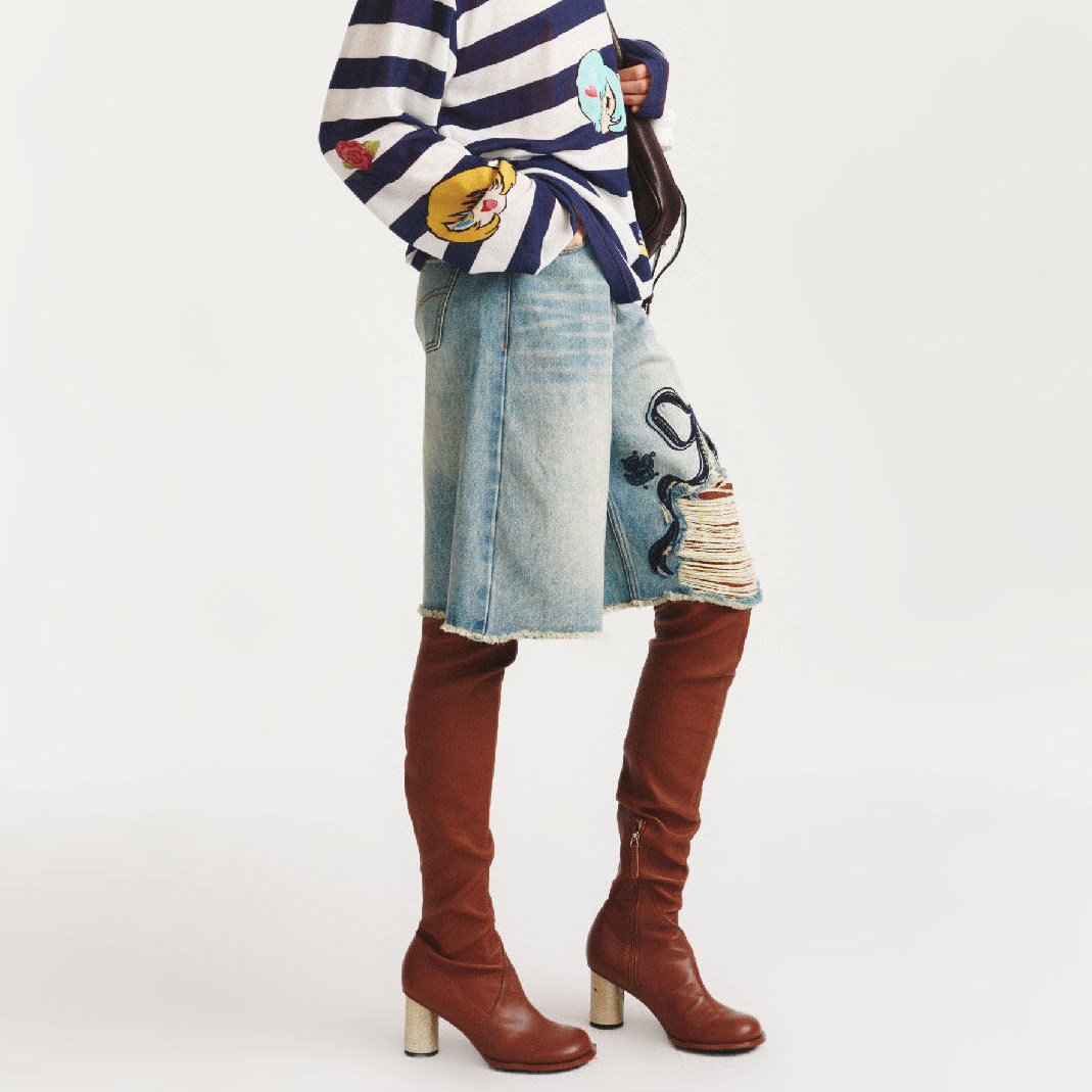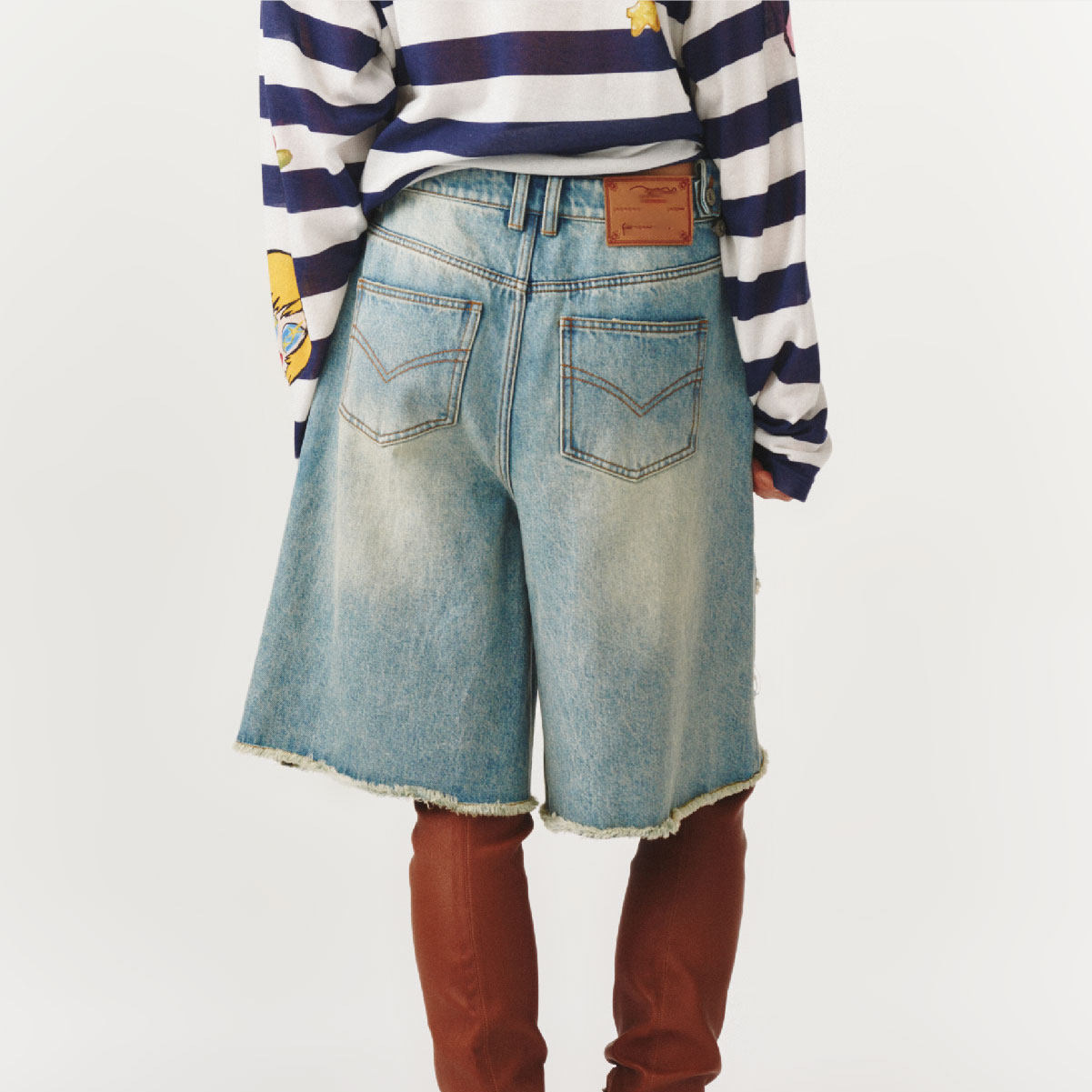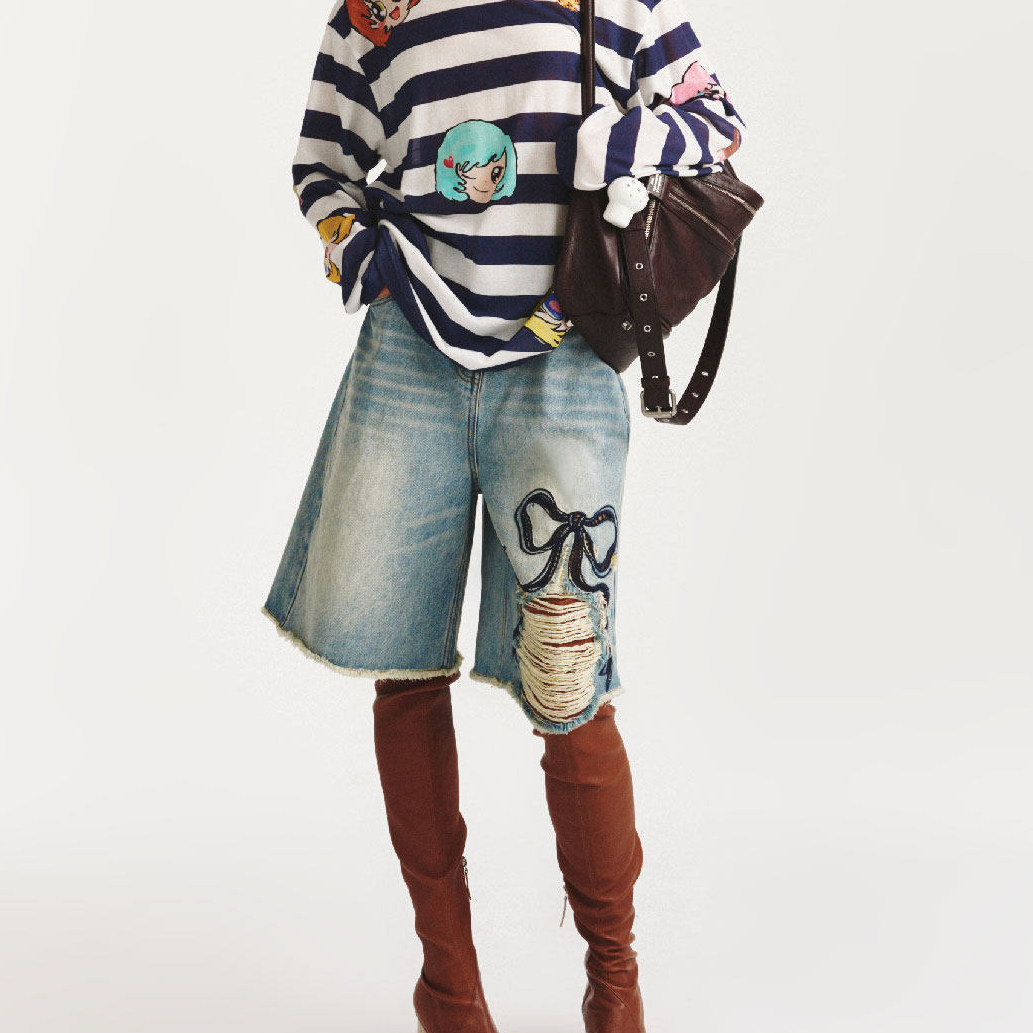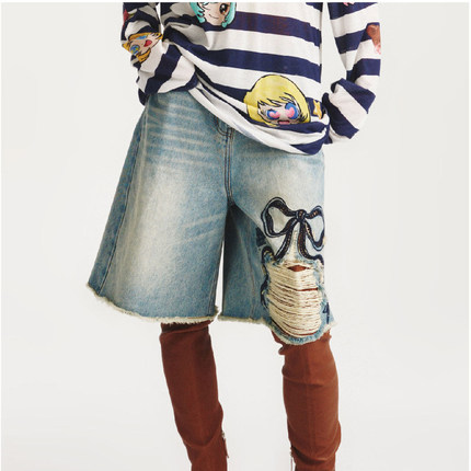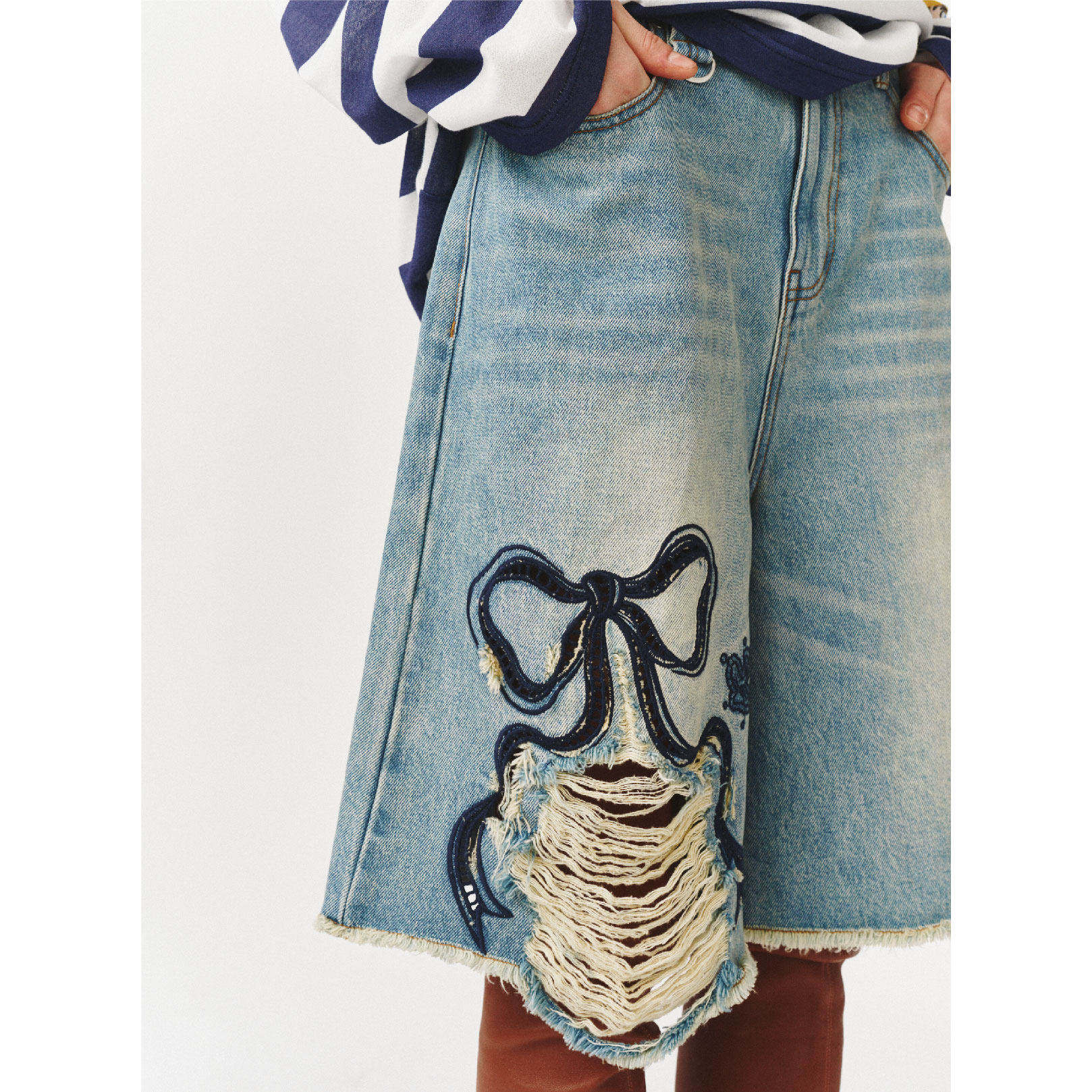 商场同款2026年春季牛仔风破洞短裤女休闲百搭蝴蝶结刺绣毛边裤子